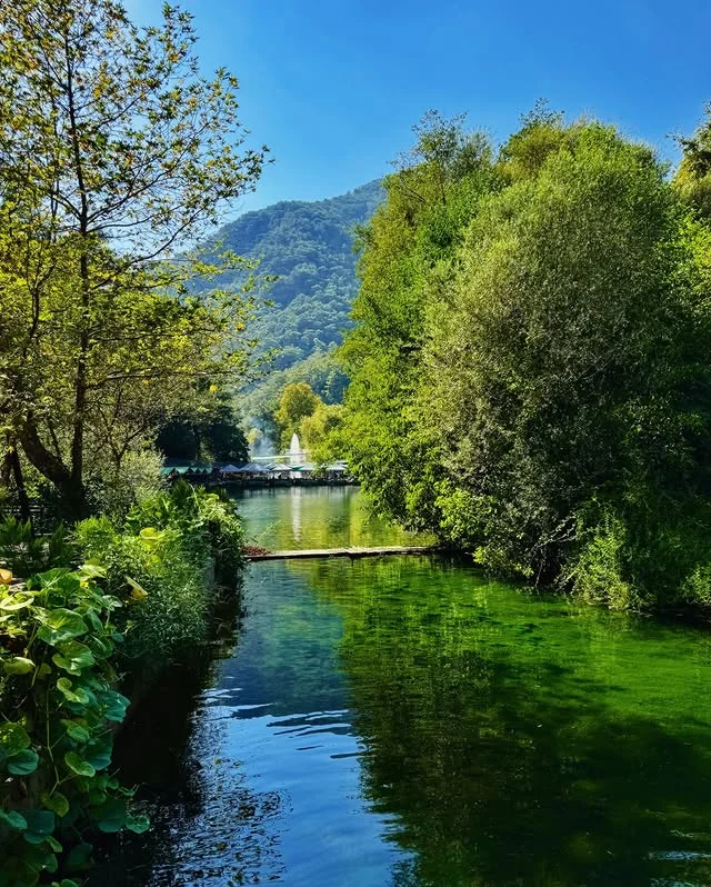 Dim Çayı'nın yakın çekiminde, ahşap balkonlu restoran ve yeşil masalarla çevrili doğal atmosfer, ziyaretçilere doğayla baş başa kalma imkanı sunuyor. Antalya'nın bu eşsiz turistik alanı, hem yerel halk hem de turistler tarafından sıkça tercih ediliyor!