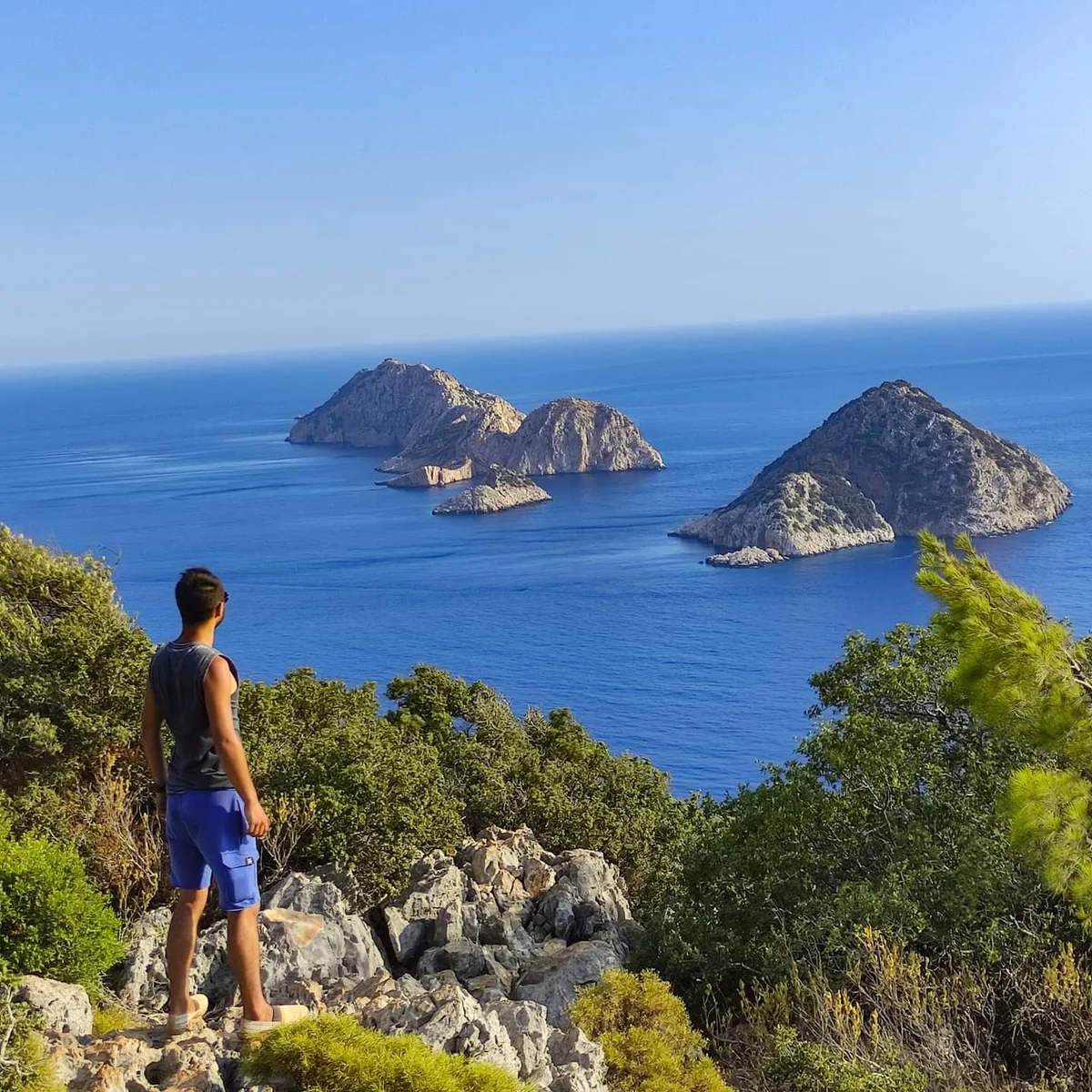 Gelidonya Feneri, bu perspektiften Türkiye'nin doğal güzellikleriyle çevrili bir keşif rotasında yer alıyor. Yürüyüş yapan üç kişi, arka planda fenerin ve mavi denizin güzelliğiyle birleşen kayalık adaların tadını çıkarıyor.