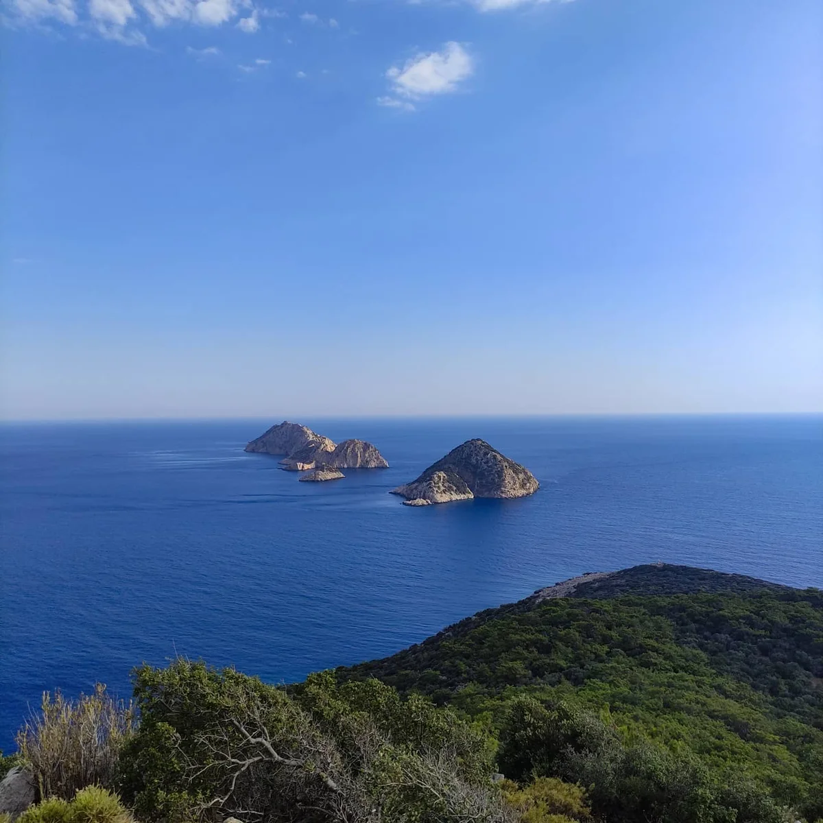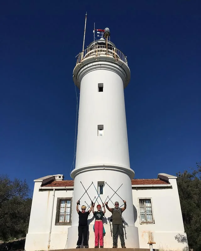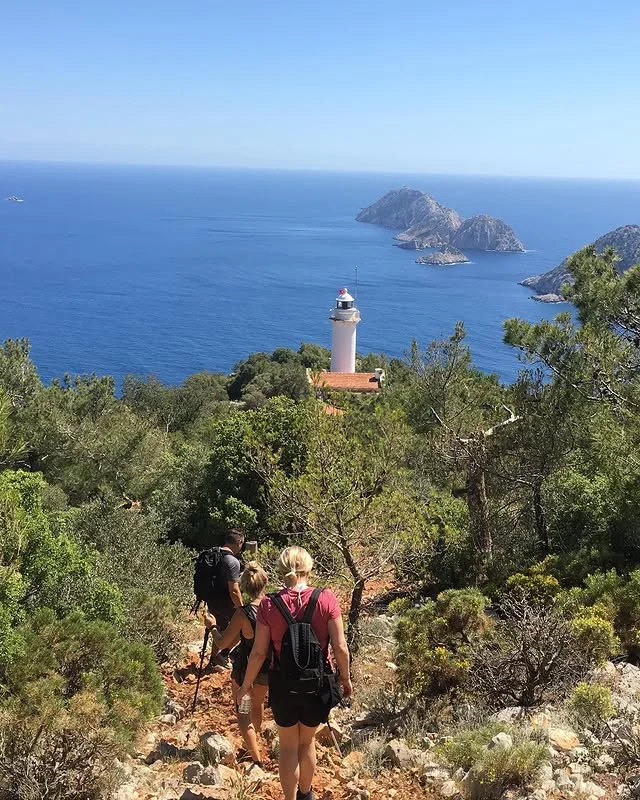 Gelidonya Feneri, keşif dolu bir yürüyüş rotasında, Türkiye'nin doğal güzellikleriyle çevrili! Bu resim, yürüyüş yapan kişilerin perspektifinden, arka planda mavi deniz ve kayalık adalarla birlikte fenerin konumunu gözler önüne seriyor. Taşlık Burnu'ndaki bu fener, doğaseverler için vazgeçilmez bir destinasyon!