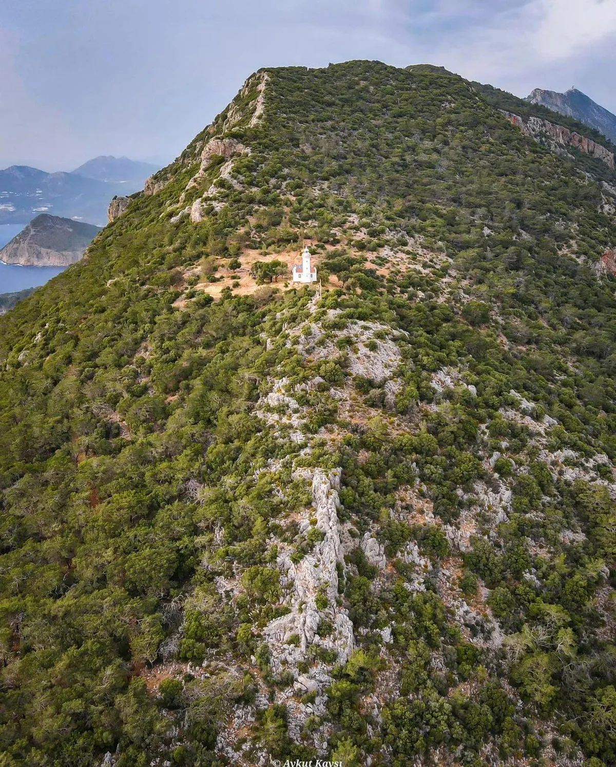 Gelidonya Feneri, Türk bayrağının gururla dalgalandığı, yeşil ormanlarla çevrili bir tarihi simge! Bu geniş açılı çekim, fenerin konumlandığı doğanın kalbinde, denizle ormanın buluştuğu noktayı vurguluyor. Mavikent Beldesi'ndeki bu yapı, ziyaretçilerine hem tarih hem de doğa ile iç içe bir deneyim sunuyor.