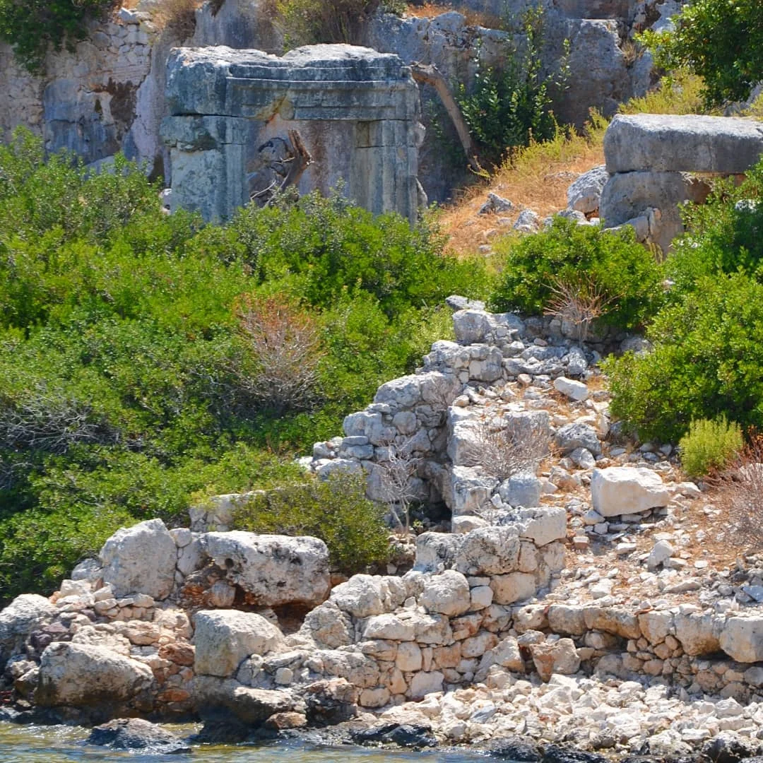 Kekova Adası'nın tarihi taş kalıntıları ve kapı yapıları, yeşillikler arasında saklı bir hazine gibi! Bu resim, eski medeniyetlerin izlerini daha yakından keşfetmek isteyenler için ideal bir perspektif sunuyor.