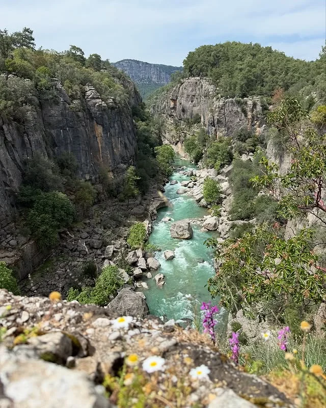 Köprülü Kanyon Milli Parkı'nın derin kanyon içerisindeki bu görüntüsü, yoğun ağaçlar ve çiçeklerle çevrili yeşil nehir manzarası sunuyor. Doğanın sunduğu bu cennet, zengin bitki örtüsüyle keşfedilmeyi bekleyen bir güzellik abidesi!