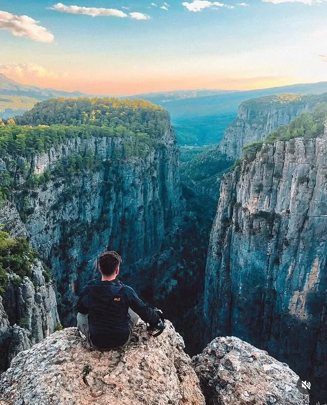 Köprülü Kanyon Milli Parkı, zengin bitki örtüsü ve etkileyici dağ manzaraları ile doğaseverler için ideal bir destinasyondur. Kayalığın kenarında oturan bir kişi, derin kanyon manzarasına bakarak doğanın huzurunu ve güzelliğini deneyimliyor. Antalya, Manavgat'ta yer alan bu milli park, doğal sit alanlarının jeolojik önemini de gözler önüne seriyor.