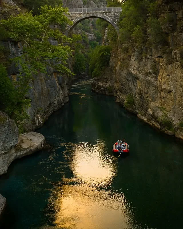 Köprülü Kanyon Milli Parkı, doğal güzellikleri ve tarihi köprüleriyle Türkiye'nin en gözde turistik alanlarından biridir. Bu resimde, kanyonun derinliklerine doğru uzanan tarihi taş köprü ve yeşil kayalıklar, doğanın gücünü ve zamanın izlerini gözler önüne seriyor. Antalya, Manavgat'ta yer alan bu milli park, jeolojik yapısıyla da dikkat çekiyor.