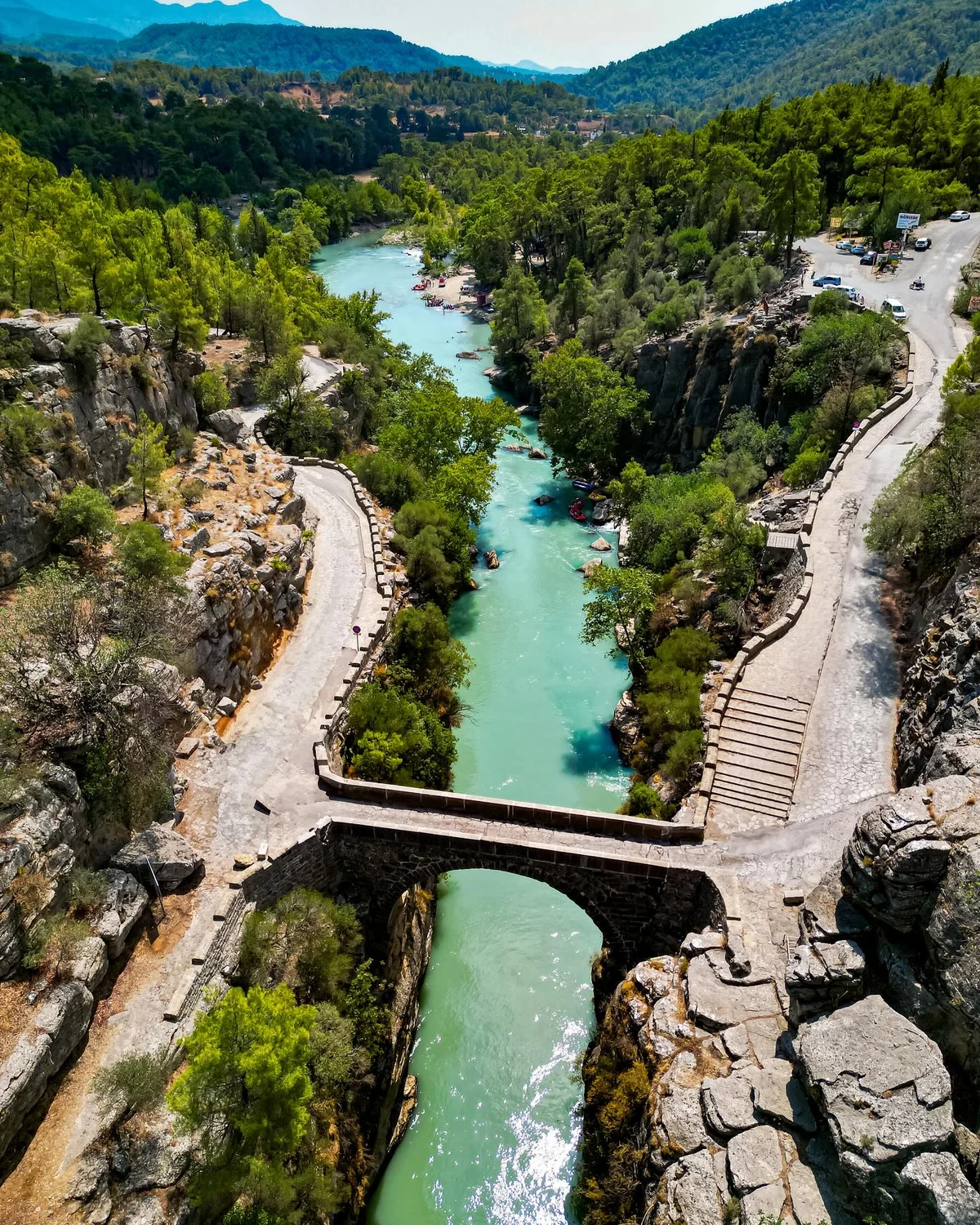 Turkuaz nehir ve sarp kayalıklar! Köprülü Kanyon Milli Parkı, Türkiye'nin doğal harikaları arasında - tarihi köprü ve yeşil ağaçlarla çevrili bu manzara, jeolojik zenginlikleriyle büyülüyor.