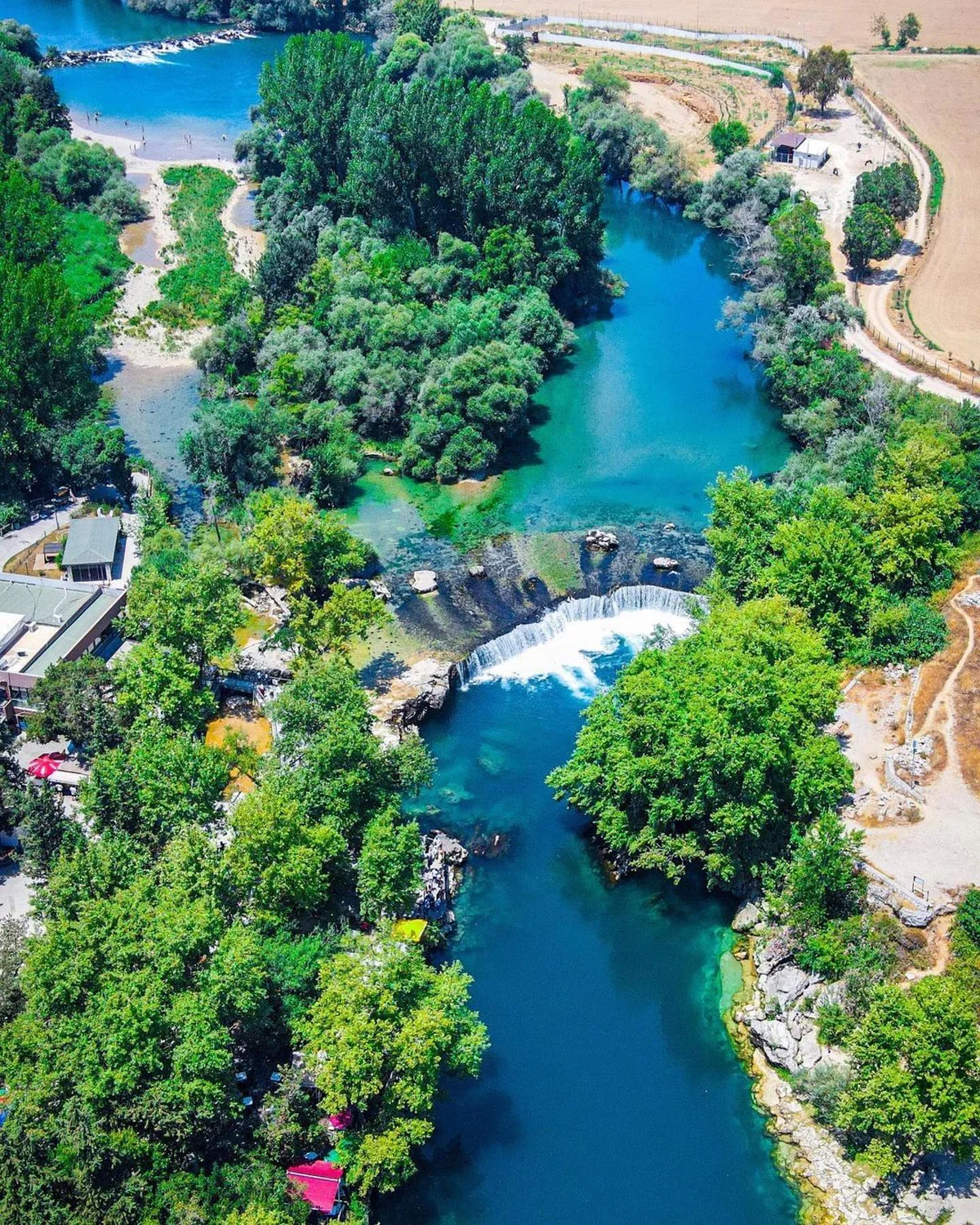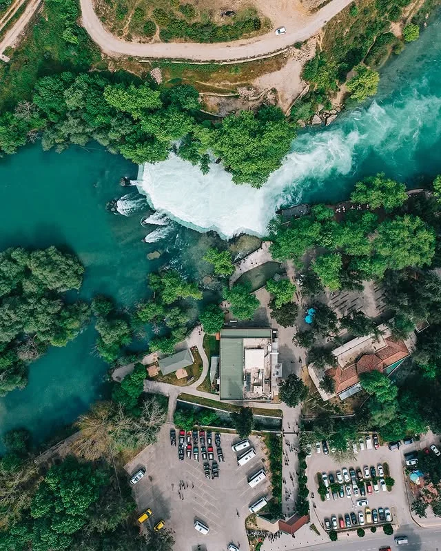 Manavgat Şelalesi'nin yukarıdan çekilmiş bu görüntüsü, beyaz köpüklerle dolu suların yeşil ağaçlarla çevrili alanı nasıl büyüleyici bir cazibe merkezi haline getirdiğini gösteriyor - düzenli yerleşimle birleşen doğal yapı!