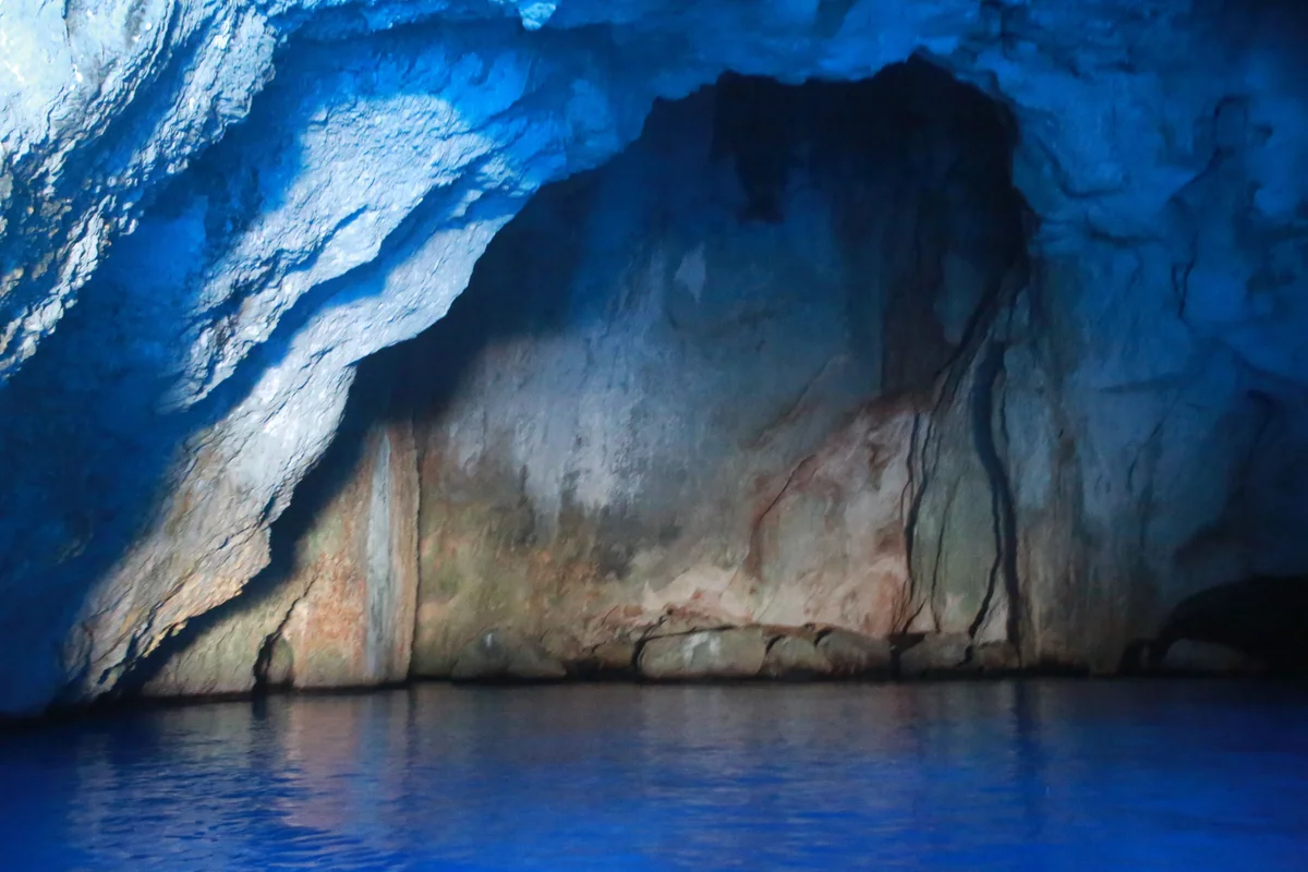 Mavi Mağara'nın doğal yapısı, göz alıcı bir atmosfer sunarak ziyaretçilerine eşsiz bir deneyim yaşatıyor. Bu açıdan mavi tonlarıyla aydınlatılmış mağara ve huzur dolu su yüzeyi görülüyor - Antalya'nın bu doğal harikası, huzur arayanların adresi!