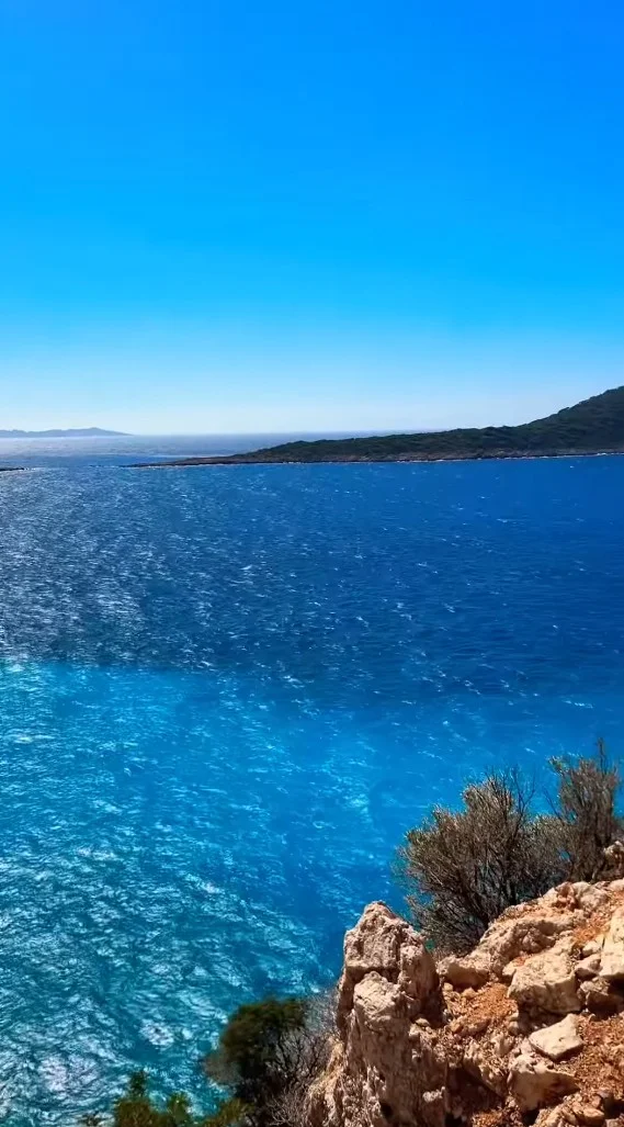 Mavi Mağara, doğal güzellikleri ve canlı deniz manzarası ile ünlü, huzur dolu bir turistik destinasyondur! Bu resim, derin mavi sularda güneşin yansıdığı huzur verici deniz manzarasını gözler önüne seriyor. Kaputaş Plajı'na yakın konumu ile de bilinen bu mağara, jeolojik ve turistik açıdan keşfedilmeye değer.