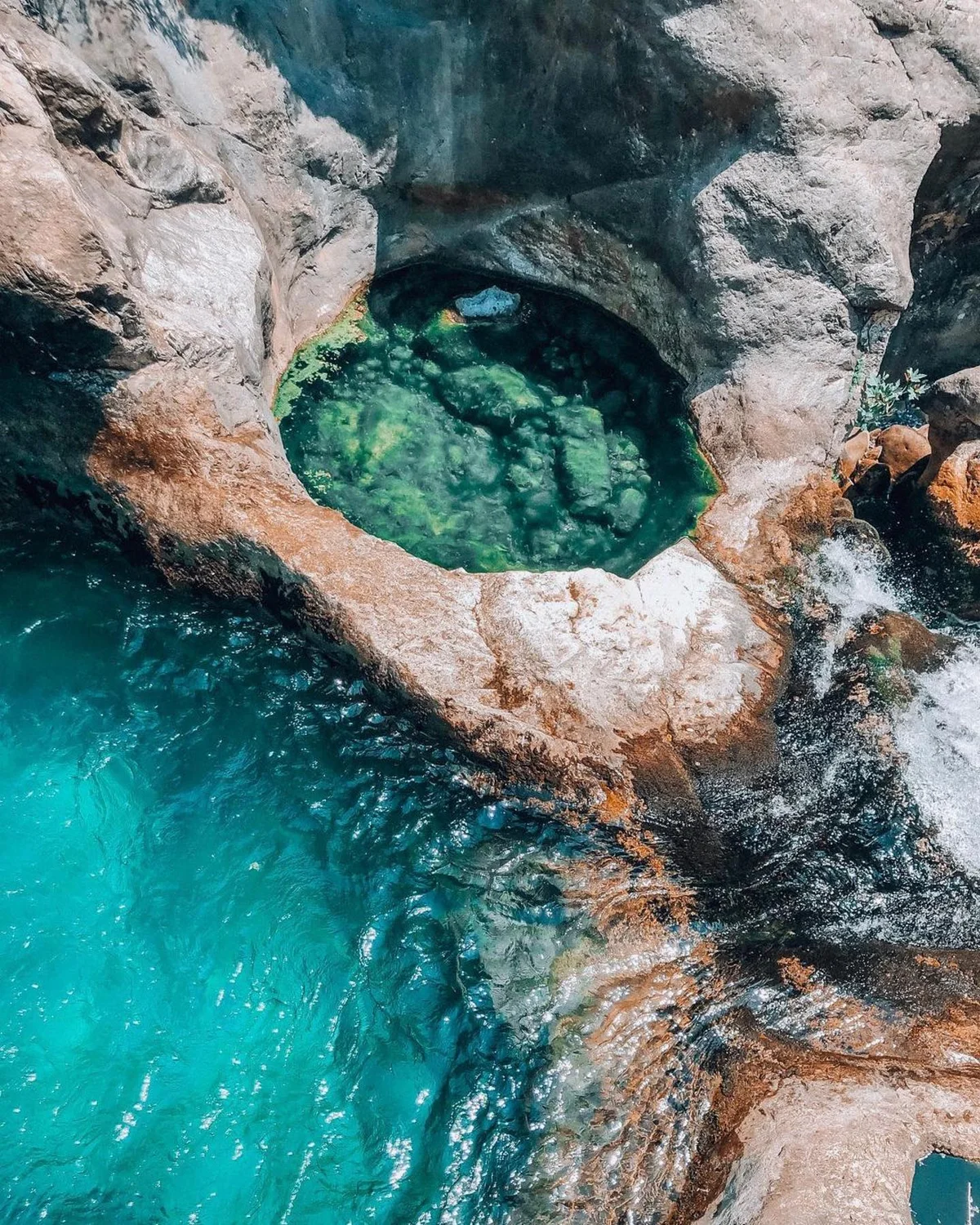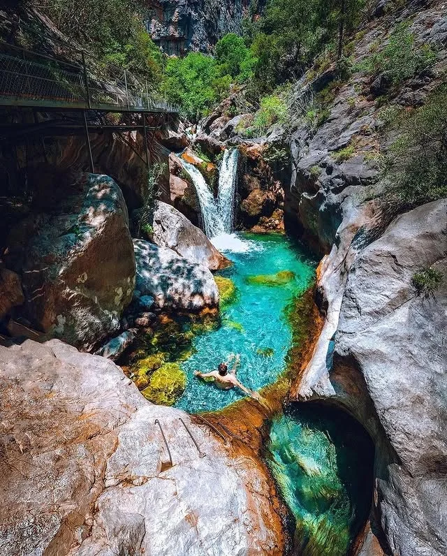 Bu açı, Sapadere Kanyonu'nun turkuaz su birikintisi ve şelalesiyle doğanın büyüsünü gözler önüne seriyor - zengin yeşil bitki örtüsü, manzarayı tamamlıyor! Antalya'nın doğal güzellikleri arasında yer alan bu kanyon, doğa severler için ideal bir kaçış noktası.