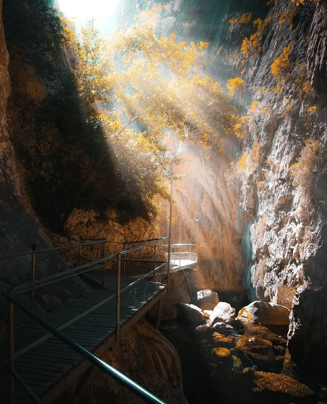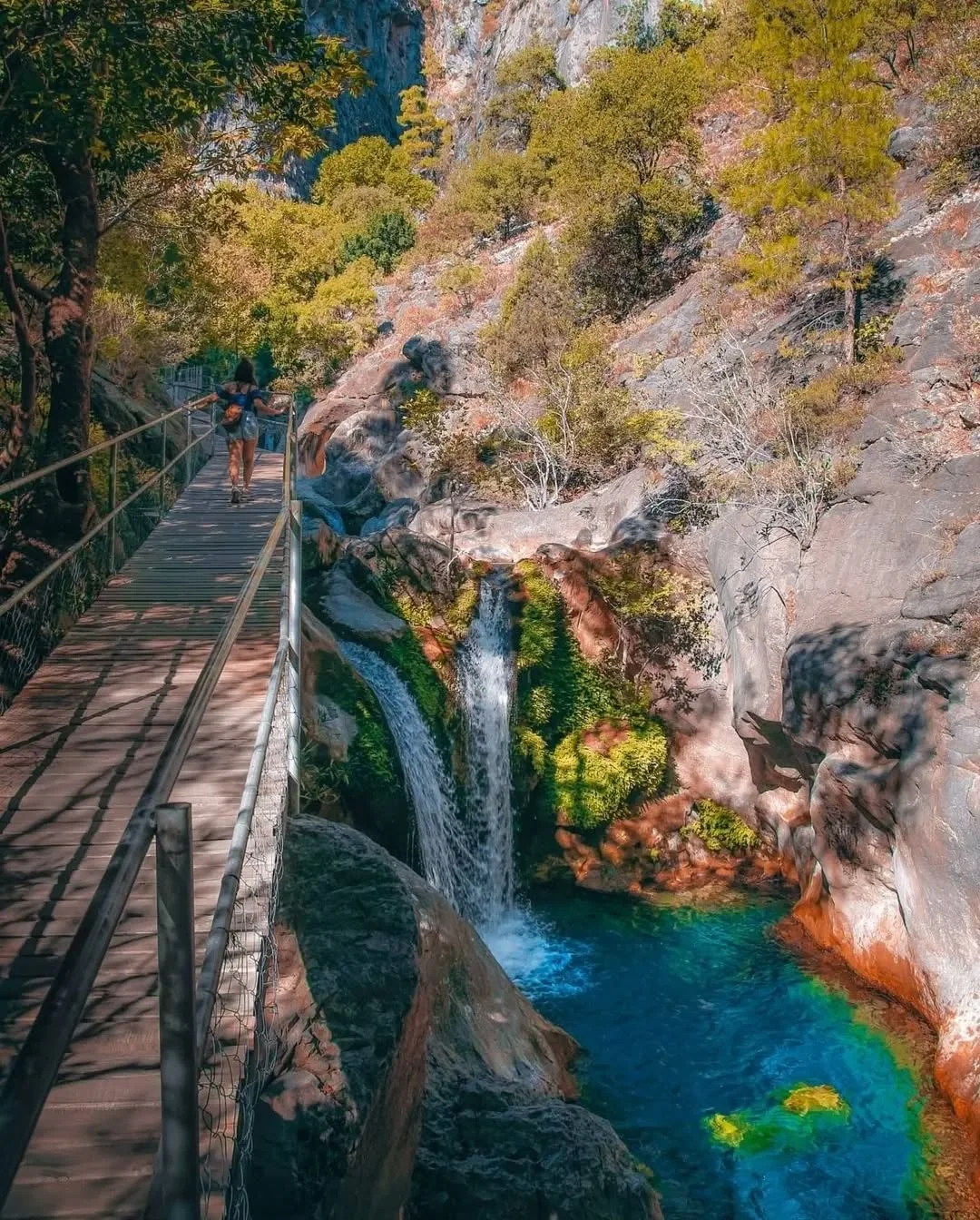 Sapadere Kanyonu'nun bu açısı, yürüyüş yolları ve arka plandaki şelale ile doğa severlere eşsiz bir manzara sunuyor - yeşil ağaçların arasında doğa yürüyüşü yapmanın keyfi başka! Antalya'nın Alanya ilçesine yakın bu kanyon, doğa turizmi için mükemmel bir destinasyon.