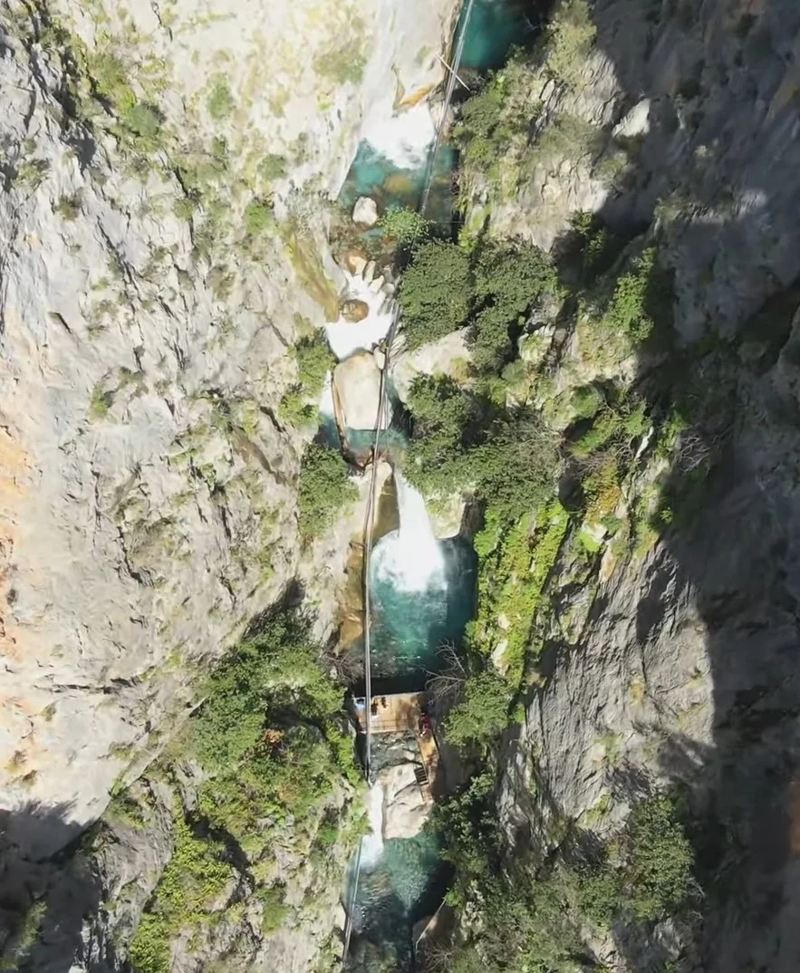 Sapadere Kanyonu'nun bu açıdan çekilmiş fotoğrafında, şelalenin kayalar arasından akışı ve mavi suyun göz alıcı görüntüsü doğal güzellikleriyle büyülüyor. Antalya'nın Alanya ilçesine yakın bu doğa harikası, ziyaretçilerine eşsiz manzaralar sunuyor!