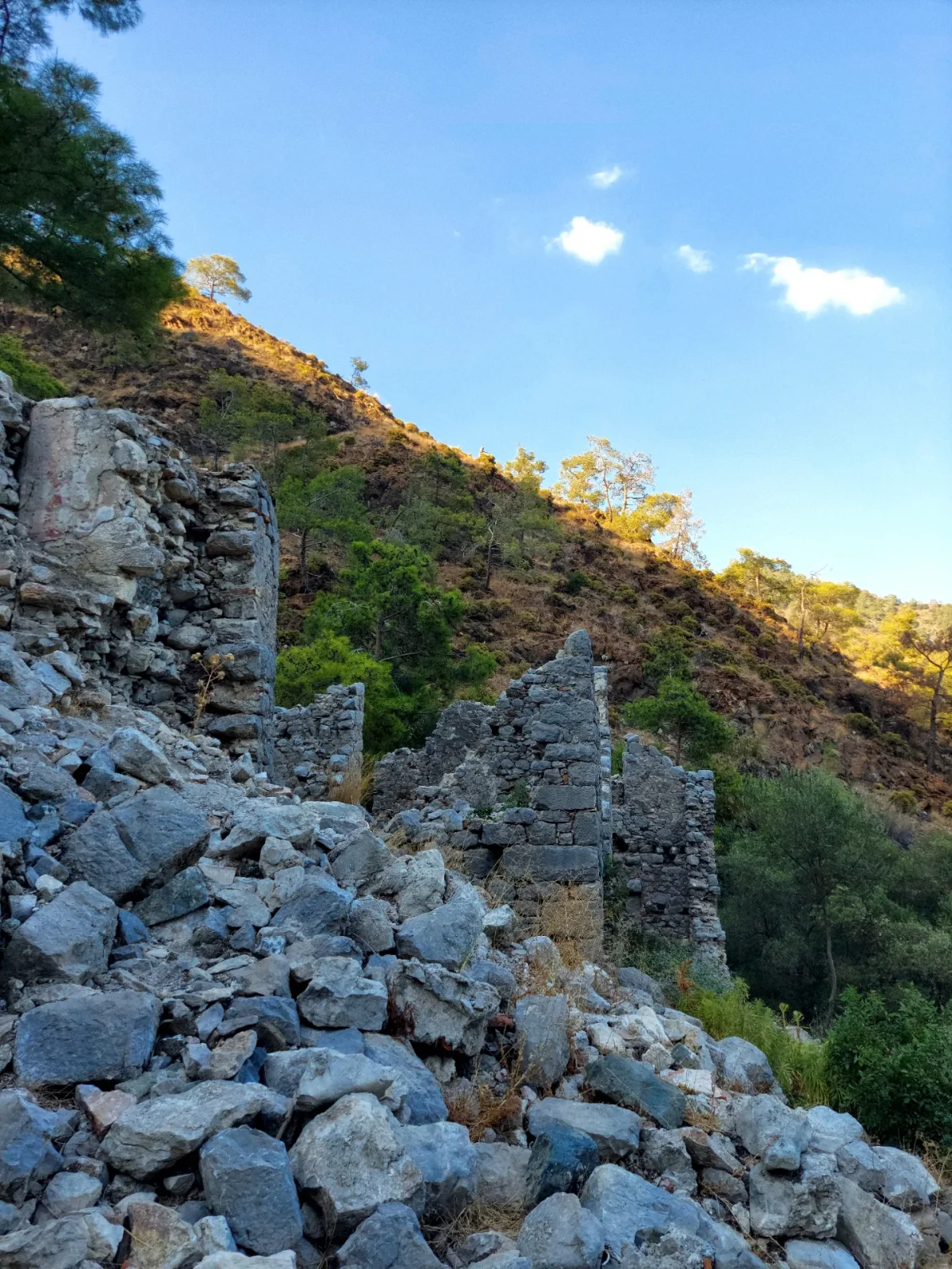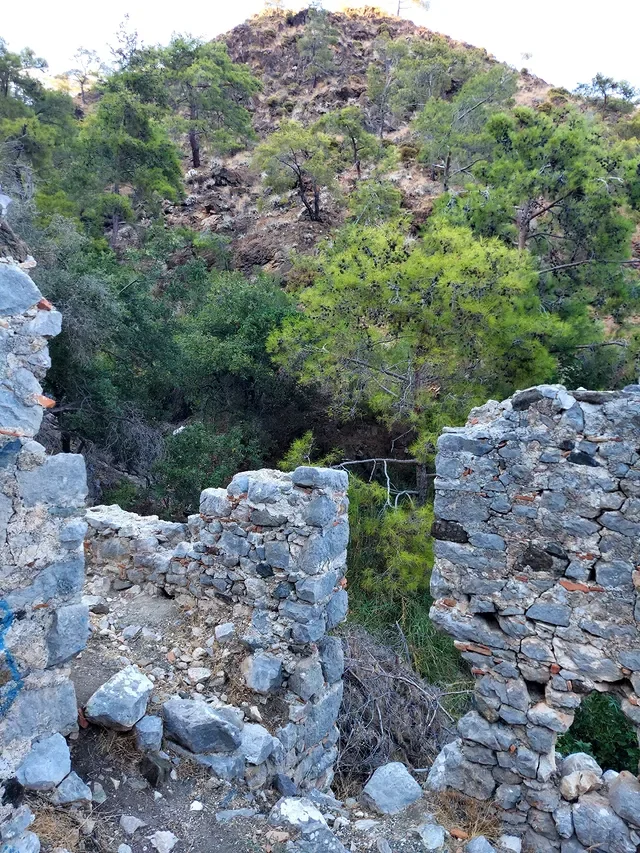 Yanartaş, tarihi kalıntıları ve zengin bitki örtüsü ile doğa yürüyüşü ve tarih meraklıları için cazip bir destinasyon. Bu geniş açı, yıkılmış taş duvarlar ve yeşil ağaçlarla çevrili alanın doğallığını ve tarihini vurguluyor.