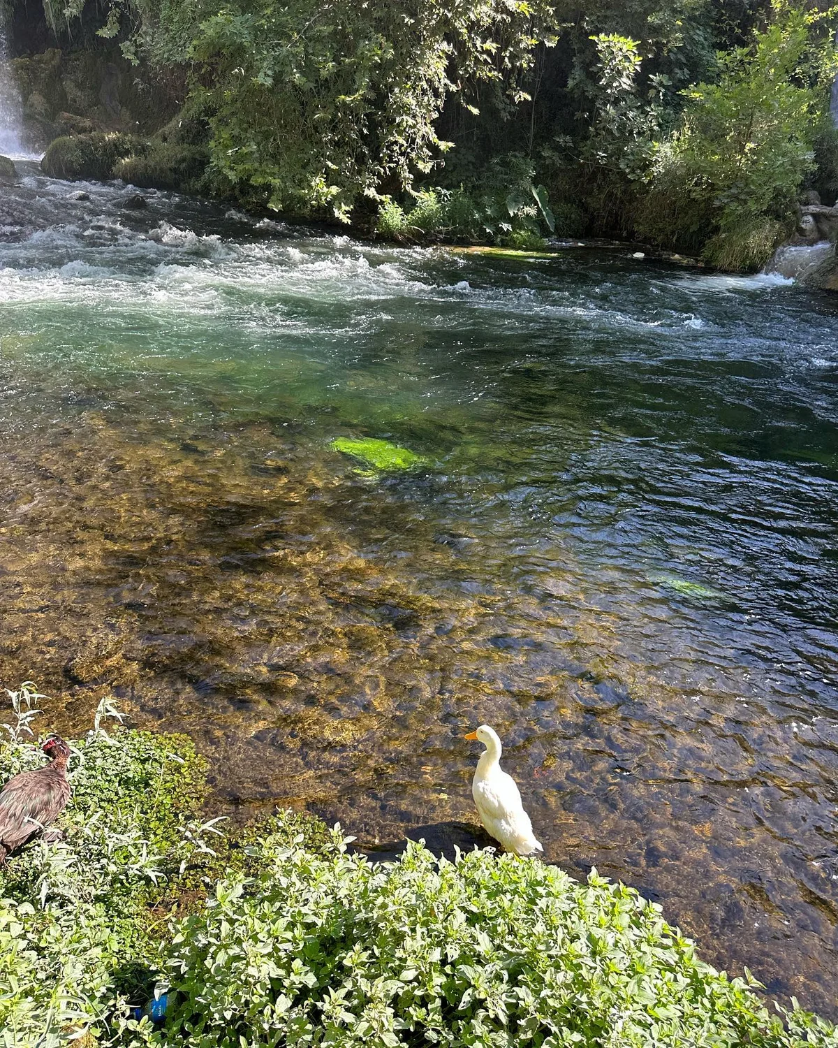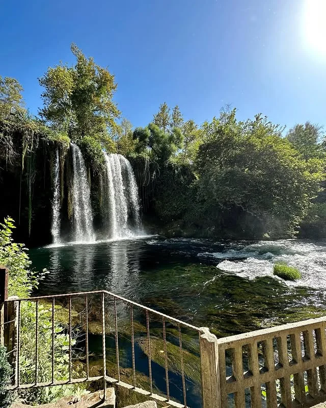 Bu açıdan görülen Yukarı Düden Şelalesi, etrafındaki yeşil alanlar ve berrak su ile huzur dolu bir atmosfer sunuyor. Beyaz ördek ve diğer kuşlar, bu doğal güzelliği daha da özel kılıyor!