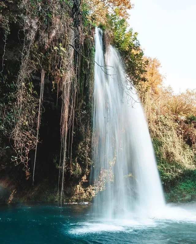 Yukarı Düden Şelalesi'nin farklı bir açıdan çekilmiş bu görüntüsü, şelalenin çevresindeki yeşil bitki örtüsü ve sararan ağaçlarla huzur dolu bir atmosfer yaratıyor. Kepez'in bu doğa harikası, ekoturizm için ideal bir destinasyon!