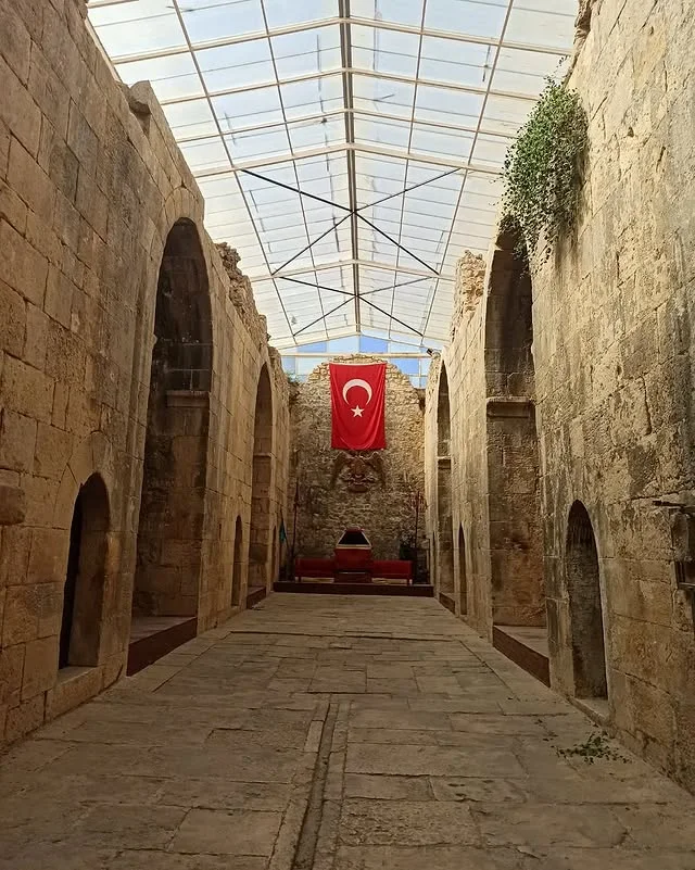 Alara Han'ın yüksek tavanlı ve taş duvarlı yapısı, modern koruma teknikleriyle birleşerek tarihi ve günümüzü buluşturuyor. Türk bayrağının asılı olduğu bu geniş alan, Alanya'nın kültürel zenginliğini yansıtıyor.