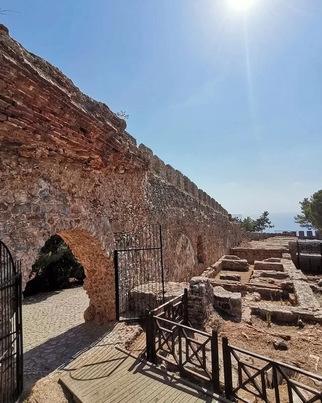 Alanya Kalesi'nin bu açısı, yıkılmış taş yapılar ve kırmızı tuğlaların oluşturduğu etkileyici bir manzara sunuyor. Savunma yapısı olarak inşa edilen bu kale, kültürel mirasın önemli bir parçası olarak günümüze ulaşmıştır.