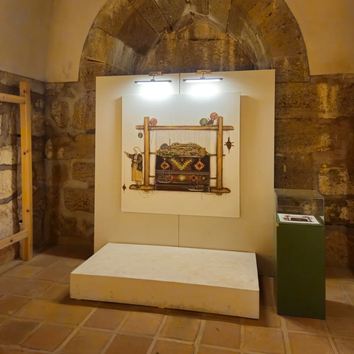Kızılkule'nin iç mekanındaki sergi alanı, tarihi ve sanatsal değerleri bir araya getiriyor. Bu yakın çekimde, taş duvarlarla çevrili alanda sergilenen dokuma tezgahı ve renkli semboller, ziyaretçilere kültürel bir yolculuk sunuyor. Alanya'nın tarih dolu bu köşesi, sanatseverler için bir cennet!