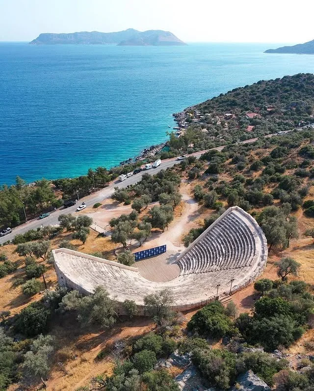 Deniz kenarındaki Antiphellos antik tiyatrosu, mavi deniz ve yeşil bitki örtüsü manzarasıyla birleşerek ziyaretçilerine tarihi ve doğal güzelliklerin eşsiz bir karışımını sunuyor. Bu konum, kültür turizmi açısından büyük bir cazibe merkezi!
