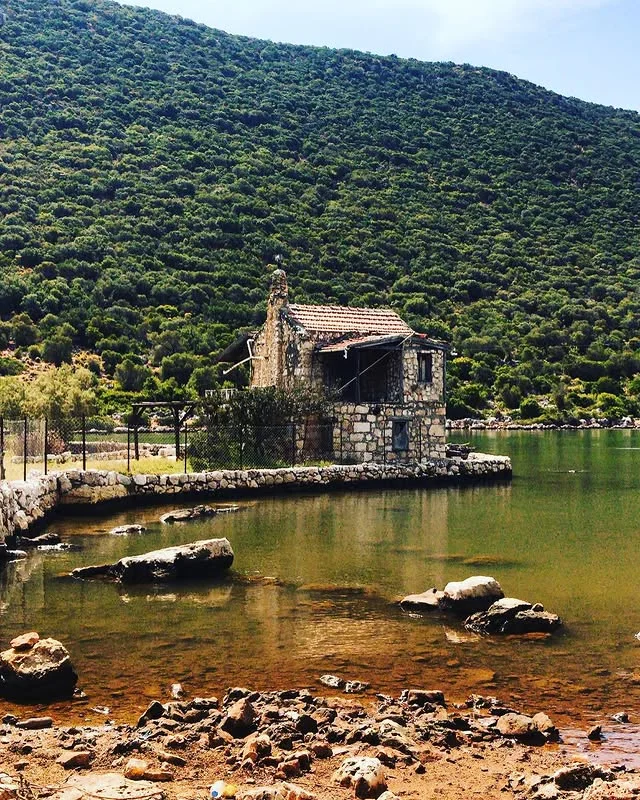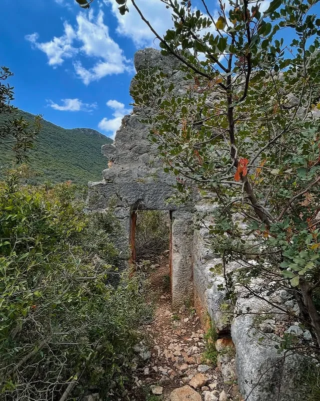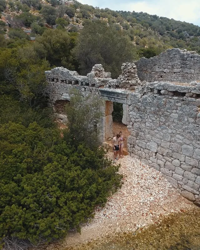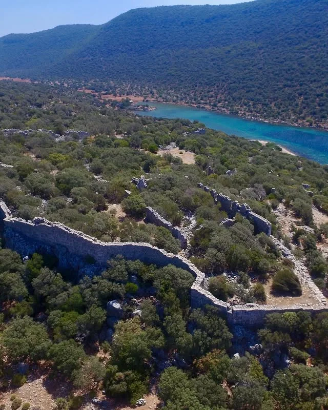 Aperlai Antik Kenti'nin deniz kenarındaki tarihi kalıntıları, doğal güzelliklerle iç içe geçmiş bir manzara sunuyor! Bu çekim, taş duvarların ve yeşil ağaçların oluşturduğu etkileyici kompozisyonu gösteriyor.