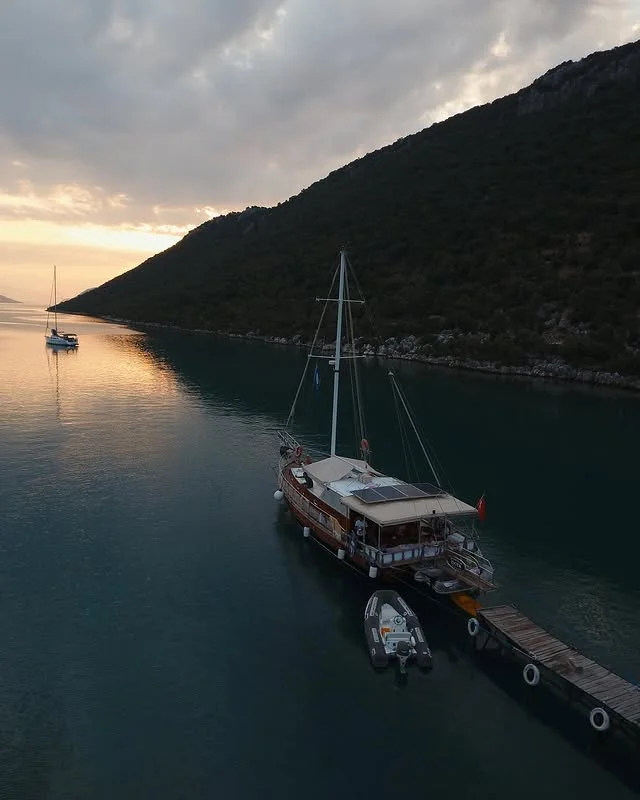 Aperlai Antik Kenti, tarihi kalıntılarıyla çevrili doğal güzellikleri ve huzurlu deniz manzarası sunan bir yer - bu resimde sakin koyda demirlemiş yelkenli tekneler vurgulanıyor. Tarihle doğanın buluştuğu bu yer, ziyaretçilerine eşsiz bir deneyim sunuyor.