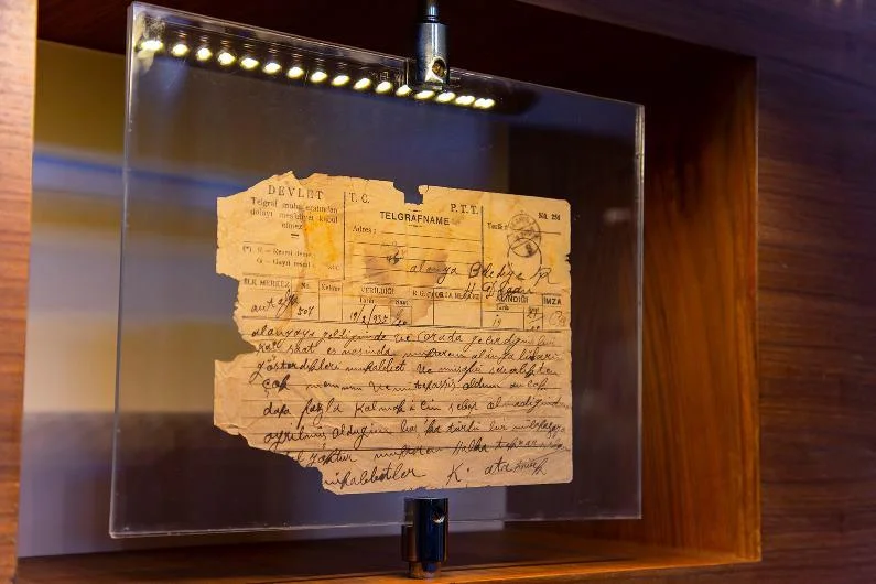 Tarihi telgrafın cam levhada korunduğu bu yakın çekim, Alanya Atatürk Evi Müzesi'nin zengin belge koleksiyonunu gözler önüne seriyor. Sararmış kağıtlar ve el yazısı notlar, geçmişin sesini bugüne taşıyor!