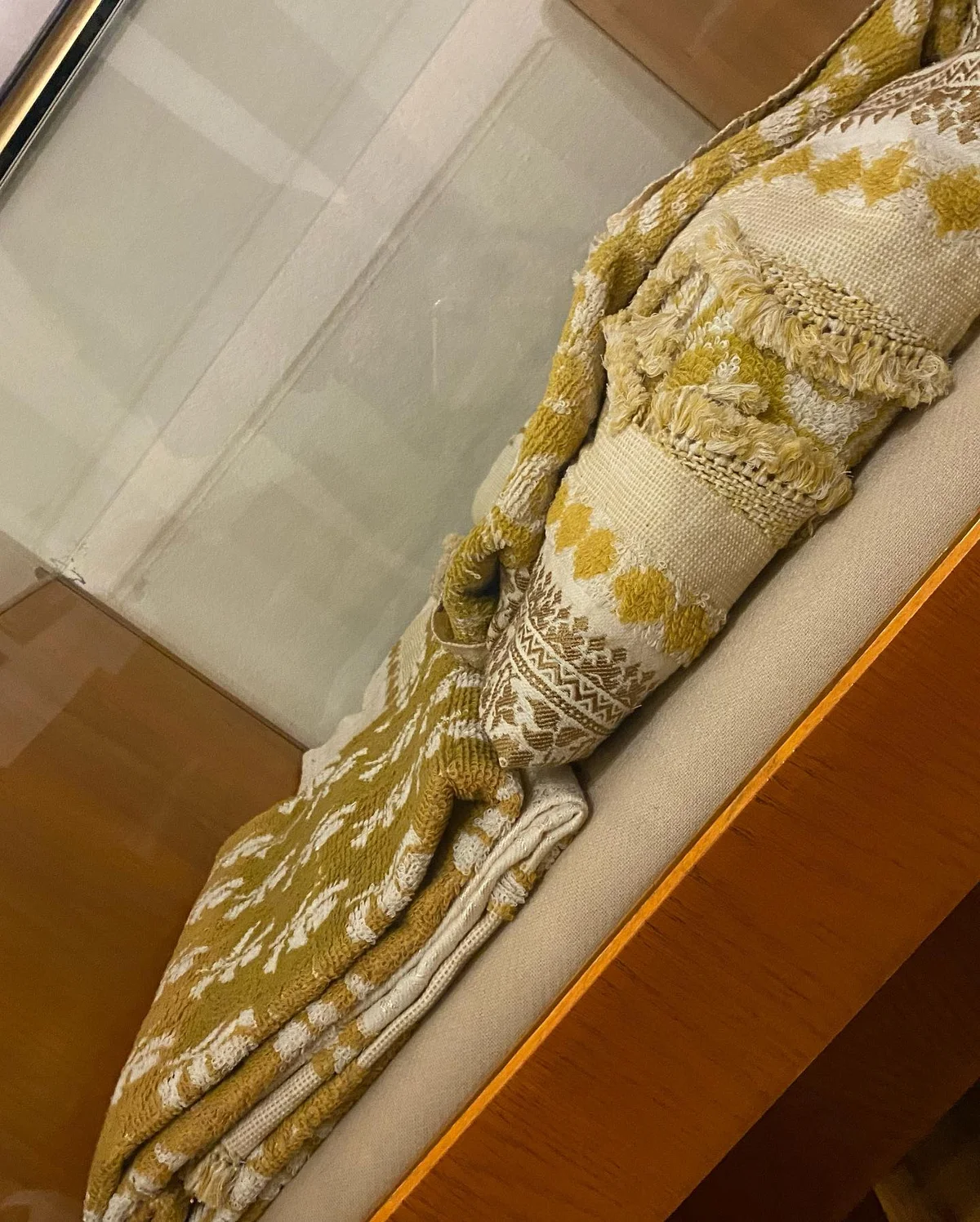 Antalya Atatürk Evi Müzesi, tarihi örtü koleksiyonlarıyla kültürel bir hazine sunuyor - sarı ve beyaz desenli örtüler, ahşap yüzeyde estetik bir şekilde sergilenmiş! Antalya'nın kalbinde yer alan bu müze, ziyaretçilerine Osmanlı ve Türkiye Cumhuriyeti tarihine dair eşsiz bilgiler sunuyor.