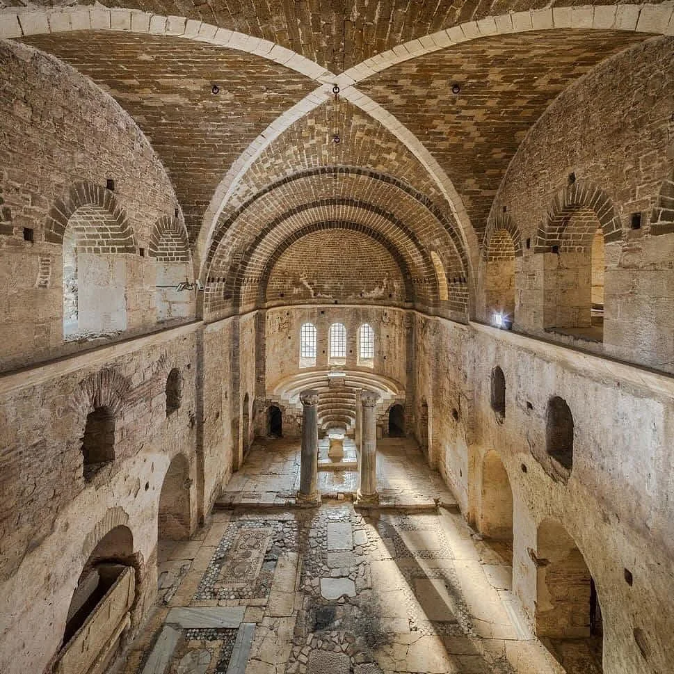 Aziz St. Nikolaos Anıt Müzesi, tarihi mimarisi ve etkileyici mozaikleriyle kültürel öneme sahip bir yapıdır! Bu resim, yüksek kemerli tavan ve taş sütunların yanı sıra zeminle birleşen mozaik desenlerin detaylarını sergiliyor. Antalya'nın kültür turizmi zenginliğine katkı sağlıyor.