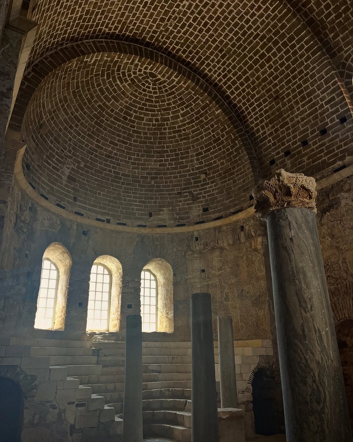 Aziz St. Nikolaos Anıt Müzesi'nin iç mekanındaki yuvarlak tavan ve sütunlar, yapının tarihi derinliğini ve mimari zenginliğini gözler önüne seriyor. Antalya'nın Demre ilçesinde yer alan bu kültürel hazine, ziyaretçilerine geçmişin izlerini sürme fırsatı sunuyor.