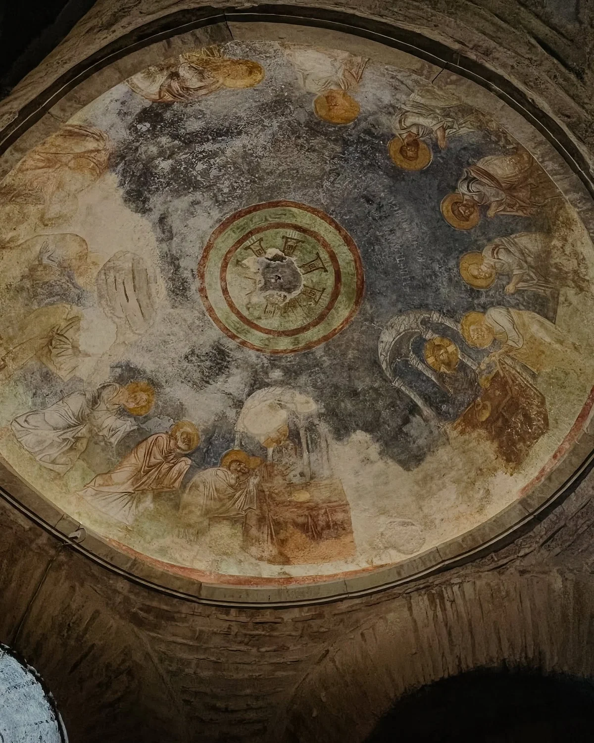 Aziz St. Nikolaos Anıt Müzesi, dini yapılar kategorisinde önemli bir fresk örneği sunarak tarihi ve sanatsal özellikleriyle dikkat çekiyor! Bu yakın çekim resim, kubbe içindeki melekler ve insan figürlerinin fresk detaylarını öne çıkarıyor. Demre'deki bu anıt, sanatsal zenginliğiyle büyülüyor.
