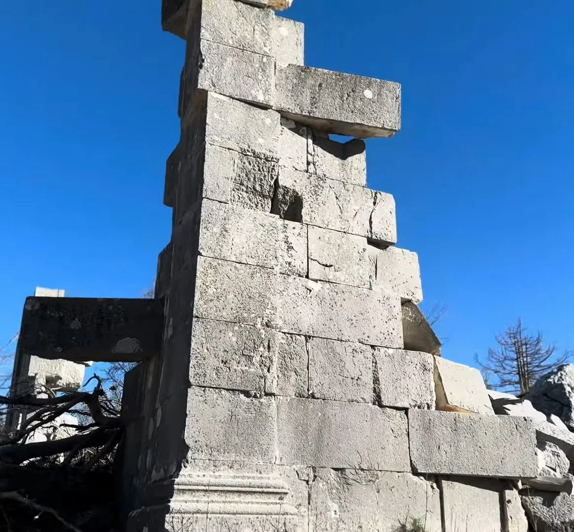 Colybrassus antik kentinin kare yapısının kalıntıları, taşlardan oluşan detaylarıyla arkeolojik önem taşıyor. Bu perspektif, yapının mimari özelliklerini ve çevresindeki doğal unsurları gözler önüne seriyor.