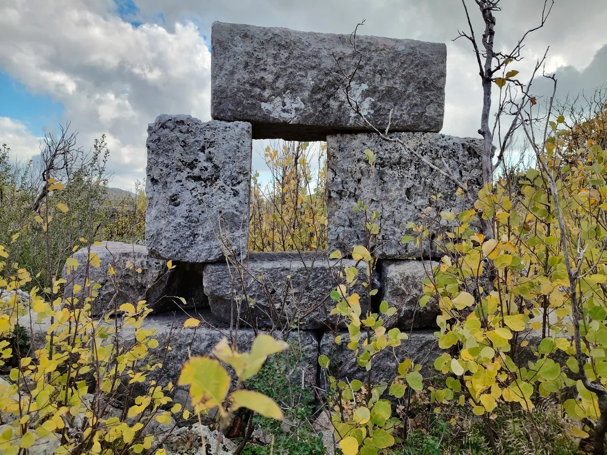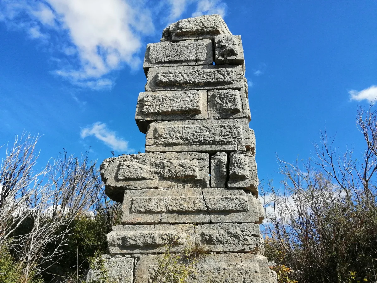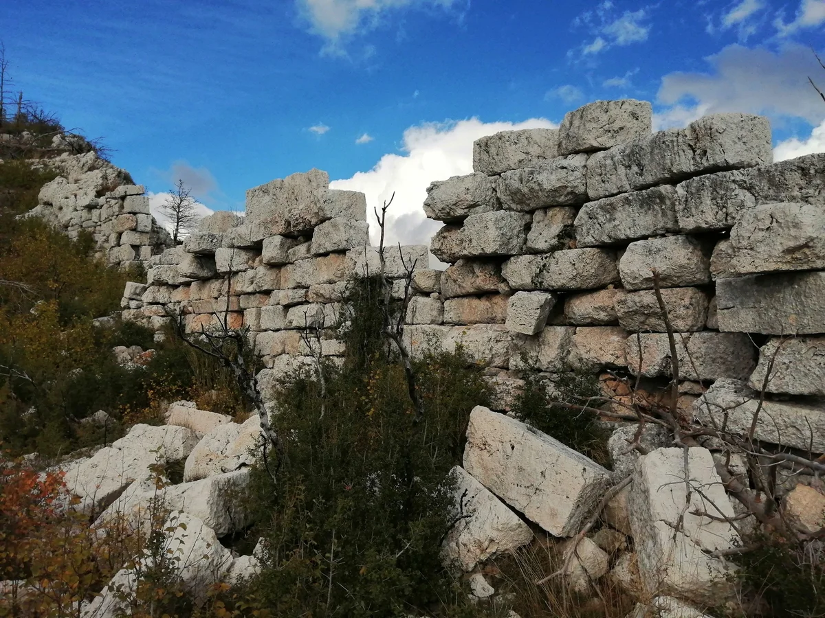Etenna Antik Kenti, tarihi kalıntıları ve doğal çevresiyle dikkat çekiyor - bu yakın çekim, taş bloklardan yapılmış yıpranmış yapı kalıntısını ve çevresindeki yeşil çalıları vurguluyor. Burası, antik dönemlerin önemli bir merkezi olarak biliniyor!