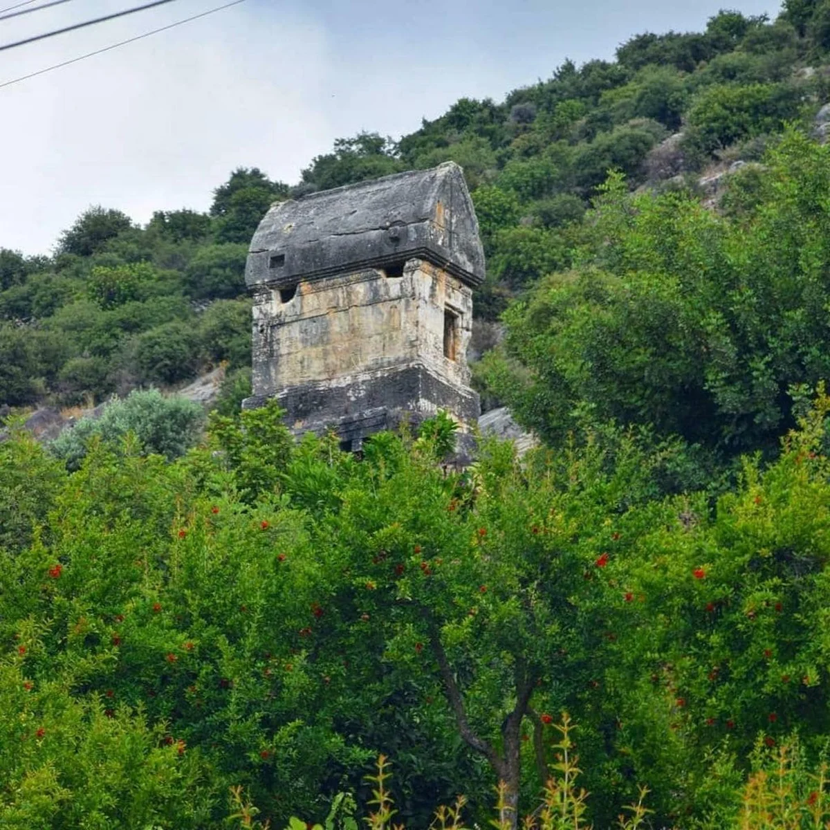 Limyra Antik Kenti'nin detaylı bir açıdan çekilmiş bu fotoğrafı, tarihi mezar yapısı ve çevresindeki nar ağaçlarıyla dikkat çekiyor - doğanın içinde tarihin izleri! Antalya'nın bu kültürel hazinesi, arkeometri ve koruma teknikleriyle korunuyor.