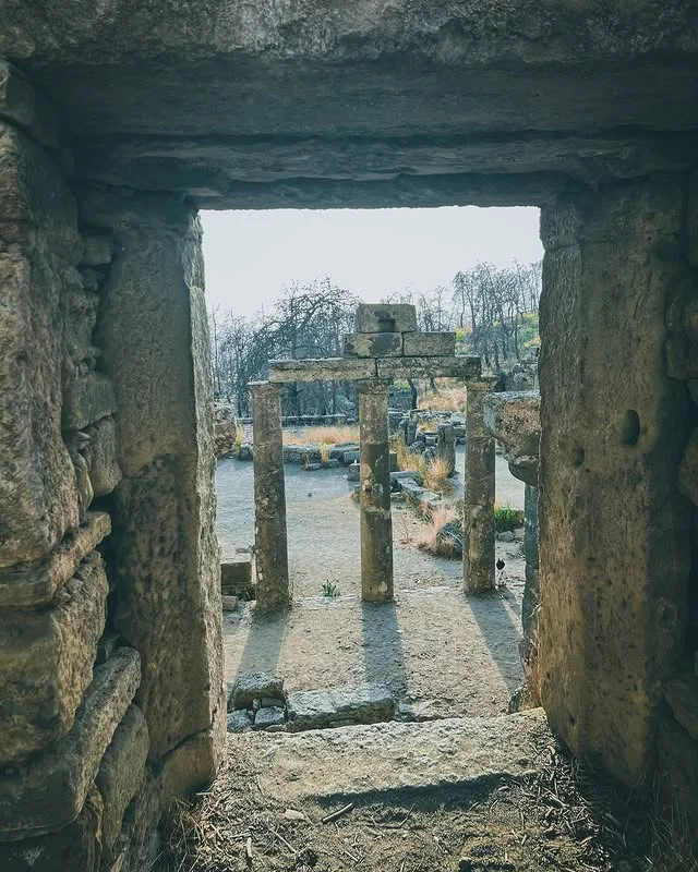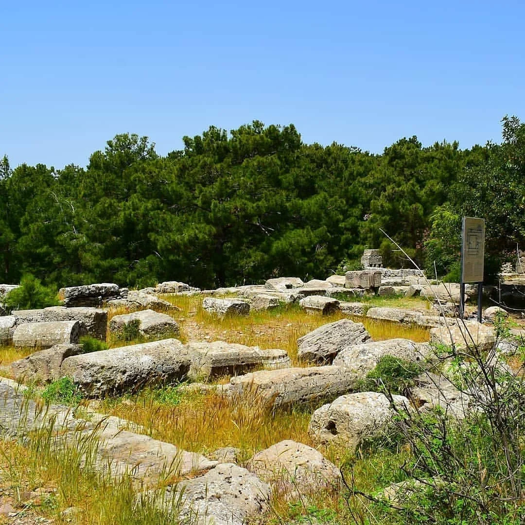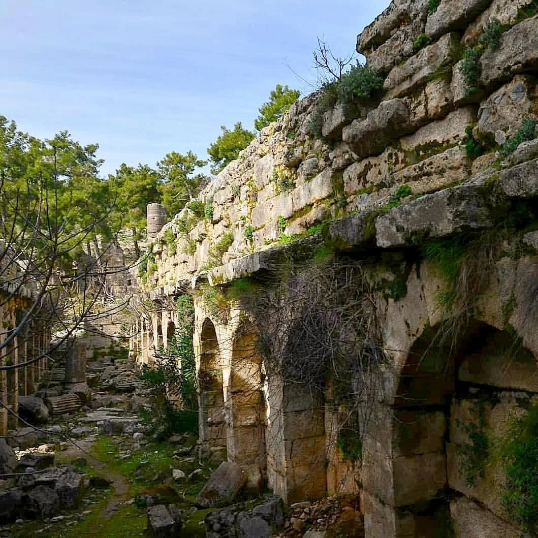 Lyrbe Antik Kenti, geçmişin izlerini taşıyan tarihi kalıntılarıyla, doğayla iç içe huzurlu bir atmosfer sunuyor. Bu perspektif, antik sütunlarla çevrili yolu ve taş yapıları gösteriyor. Yeşil ağaçlarla çevrili bu alan, ziyaretçilere tarih ve doğanın iç içe geçtiği bir deneyim sunuyor!