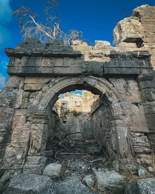Lyrbe Antik Kenti'nin yıkık yapıları, yuvarlak kemerle çevrili girişi ve kurumuş ağaçlarıyla, geçmişin derin izlerini taşıyor. Antalya'nın Manavgat ilçesindeki bu ören yeri, Anadolu medeniyetlerinin zengin mirasını gözler önüne seriyor.
