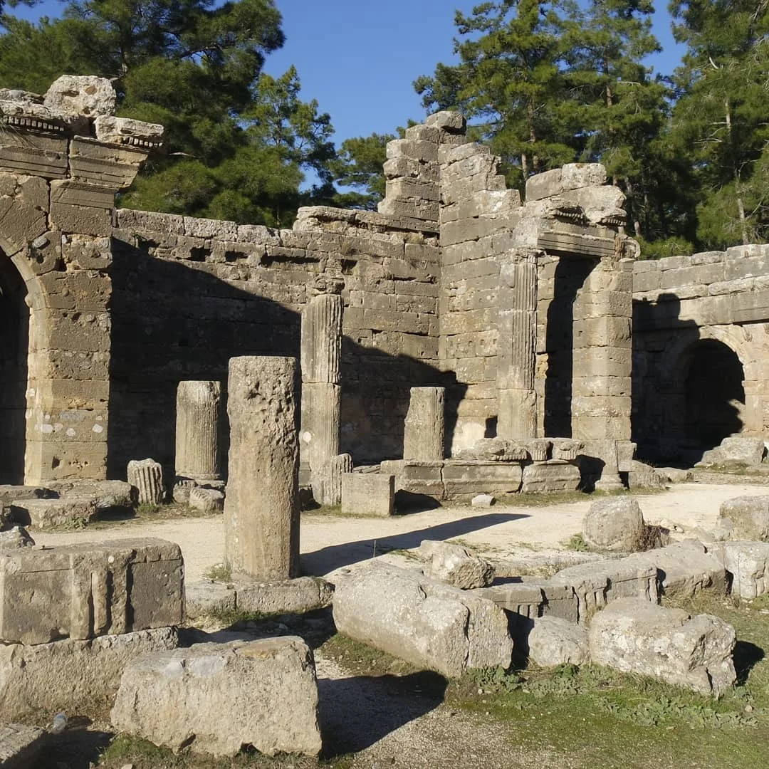 Lyrbe Antik Kenti, tarihi yapısı ve doğal güzellikleri ile dikkat çekici bir arkeolojik alan sunmaktadır. Bu resimde, tarihi yapının iç kısmından dışarı açılan manzara, taş sütunlar ve yeşil ağaçlar ile çevrili bir alanı gözler önüne seriyor. Manavgat'ın Bucakşeyhler Mahallesi'nde yer alan bu ören yeri, tarihin ve doğanın iç içe geçtiği bir mekandır.