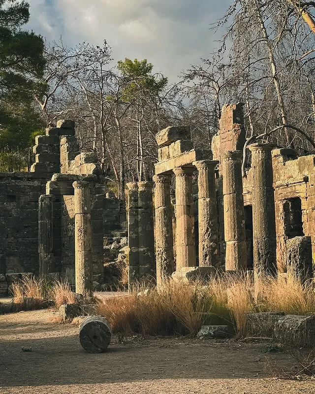 Lyrbe antik kenti, yıkılan sütunlar ve kurumuş ağaçlarla dolu geniş açılı bu çekimde, tarihi kalıntıları ve doğal çevresiyle kültürel bir hazine sunuyor. Antalya'nın Manavgat ilçesinde yer alan bu ören yeri, geçmişin izlerini günümüze taşıyor.
