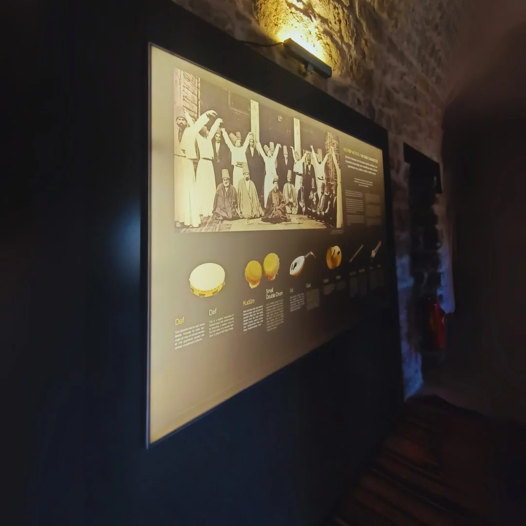 Mevlevihane Müzesi'nde, geleneksel müzik aletleri ve kültürel miras sergileniyor. Taş duvarlı ortamda, eski kıyafetli insanlar ve müzik aletleri, ziyaretçilere tarihi bir yolculuk sunuyor. Bu açıdan, müzenin kültürel zenginliği ön plana çıkıyor!