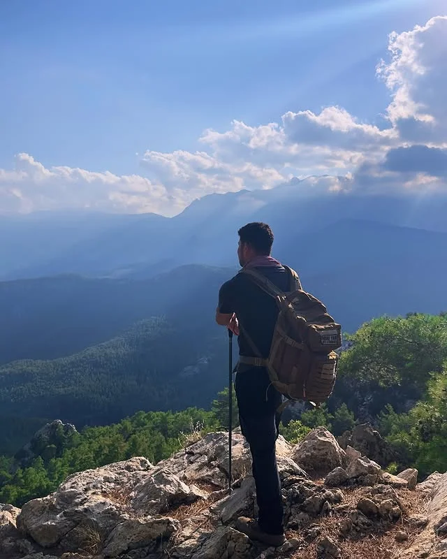 Mnara Antik Kenti'nin doğal güzellikleri, yürüyüşçünün baktığı dağ manzarasında can buluyor. Bu destinasyon, Antalya'nın eşsiz doğası ve tarihi kalıntılarıyla doğa severleri kendine çekiyor.