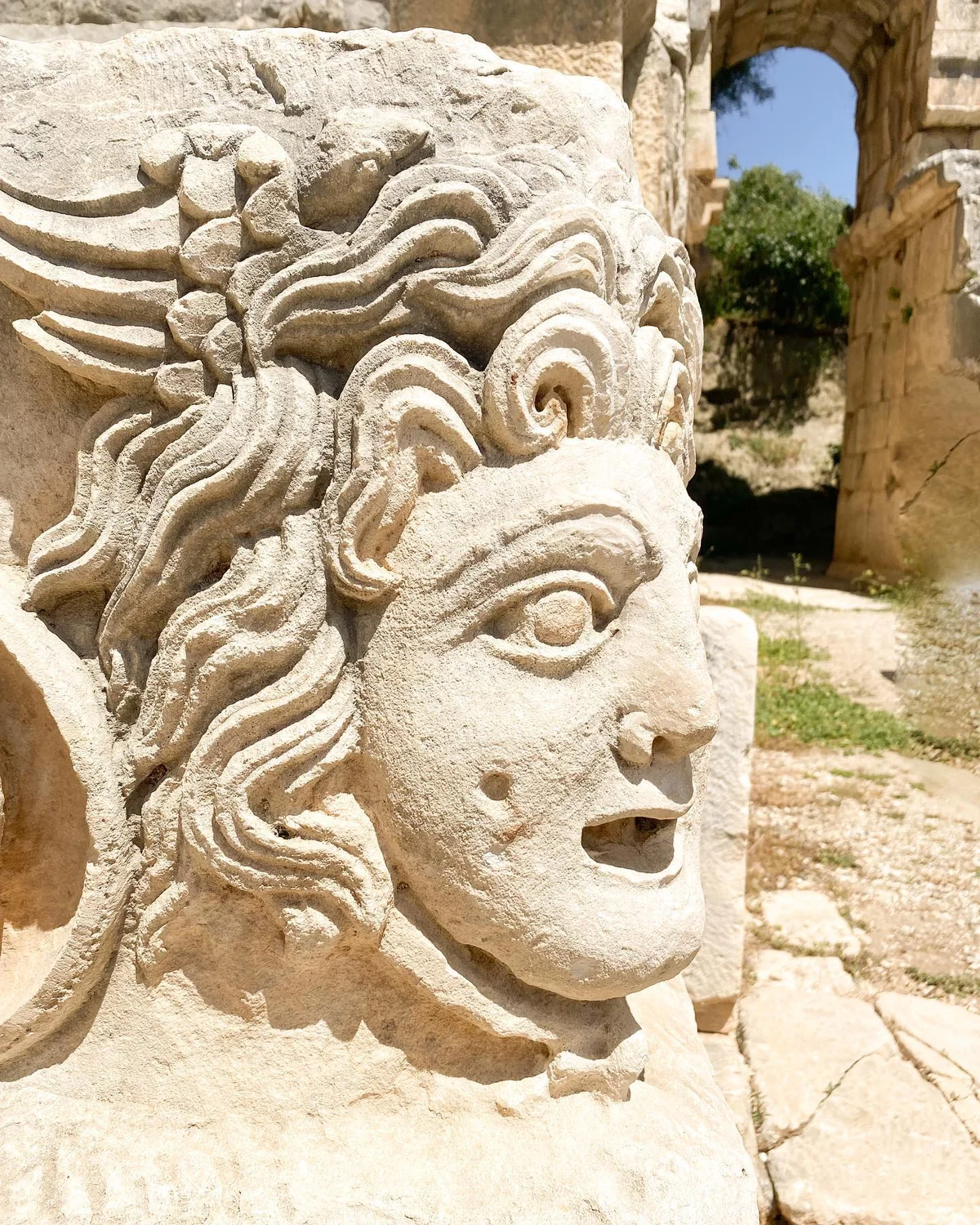 Myra Antik Kenti'nin zengin mimarisi, bu taş heykelin detaylarıyla antik dönemin izlerini gözler önüne seriyor. Antalya, Demre'deki bu tarihi alan, kültürel mirasın korunması açısından büyük önem taşıyor.