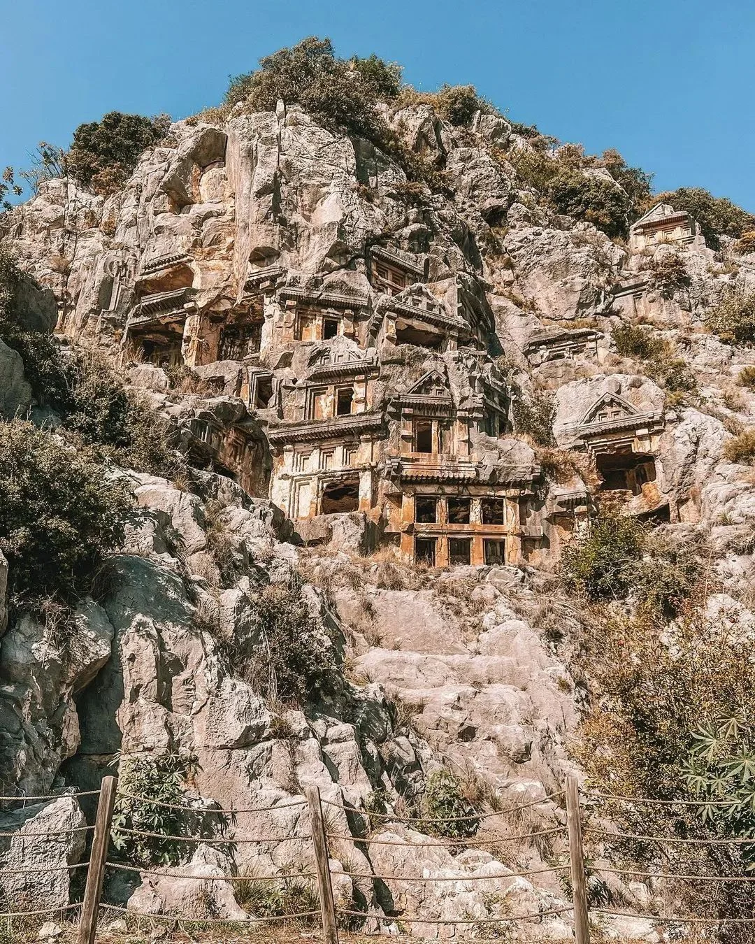 Antik dönem mimarisinin etkileyici örnekleri, Myra Antik Kenti'nde sarp kayalıklar üzerinde yükseliyor. Detaylı işçilikle tasarlanmış bu mezar yapıları, tarih meraklıları için adeta bir açık hava müzesi! Antalya'nın kültürel zenginliklerinden biri olan bu arkeolojik alanı keşfedin.