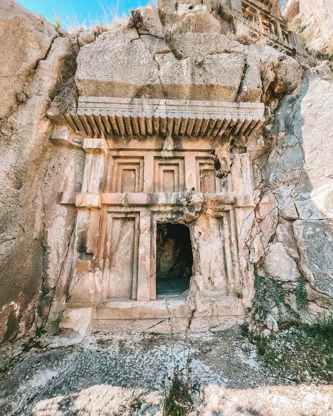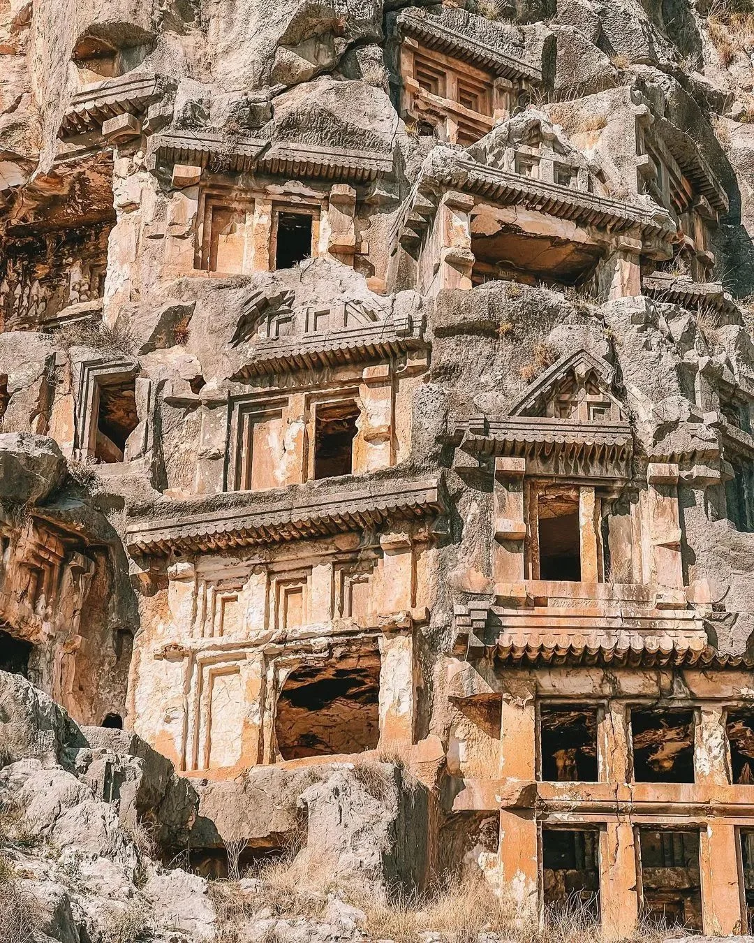 Yakın çekimle sunulan bu resim, Likya dönemine ait taş oymaların ve mezar odalarının büyüleyici detaylarını öne çıkarıyor. Myra, arkeoloji meraklıları için adeta bir açık hava müzesi!