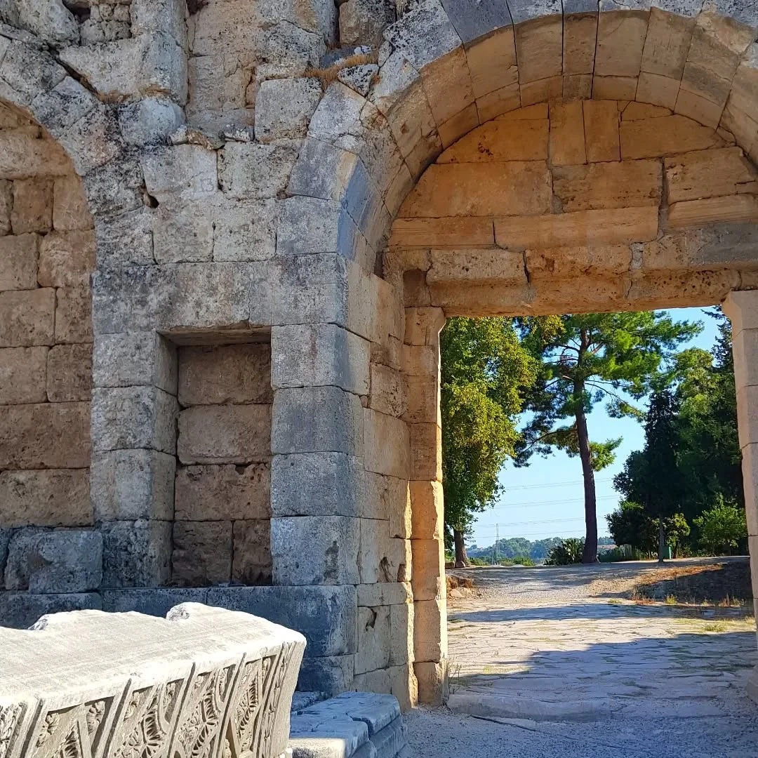 Perge Antik Kenti'nin kemerleri, tarihi ve mimari zenginliğiyle dikkat çekiyor - mavi gökyüzü ve yeşil ağaçlar eşliğinde! Antalya'nın bu resmi lokasyonu, kültürel mirasın canlı bir örneği.
