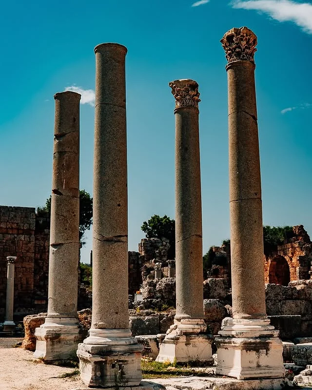 Antik Perge'nin uzun sütunları, Roma döneminin mimari ihtişamını gözler önüne seriyor - mavi gökyüzü altında etkileyici bir manzara! Antalya, Aksu'daki bu arkeolojik alan, kültür turizmi için bir hazine.