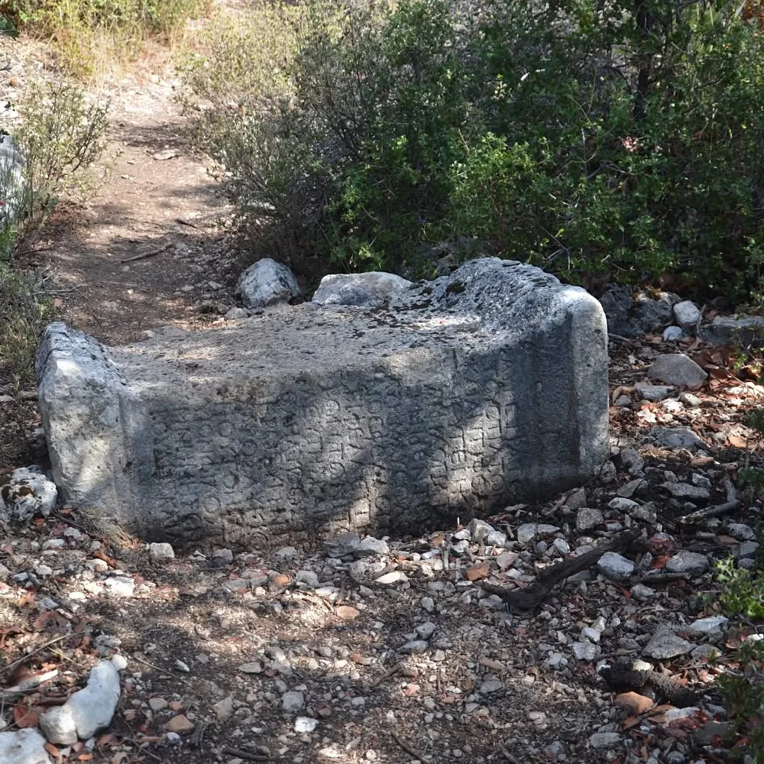 Yakın çekimle sunulan bu resimde, Phellos Antik Kenti'ndeki tarihi bir taş blok üzerindeki yazılar ve semboller dikkat çekiyor. Epigrafya ve seramik analizi açısından önemli olan bu detaylar, kentin arkeolojik değerini artırıyor.