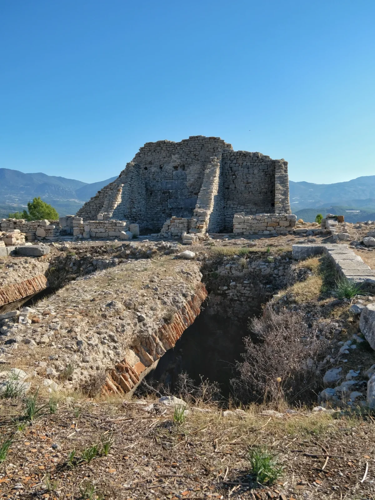 Bu geniş açıdan çekilen Rhodiapolis Antik Kenti görüntüsü, açık gökyüzü altında uzanan antik kalıntıları ve büyüleyici dağ manzarasını sergiliyor - tarih ve doğanın iç içe geçtiği bir arkeolojik alan!