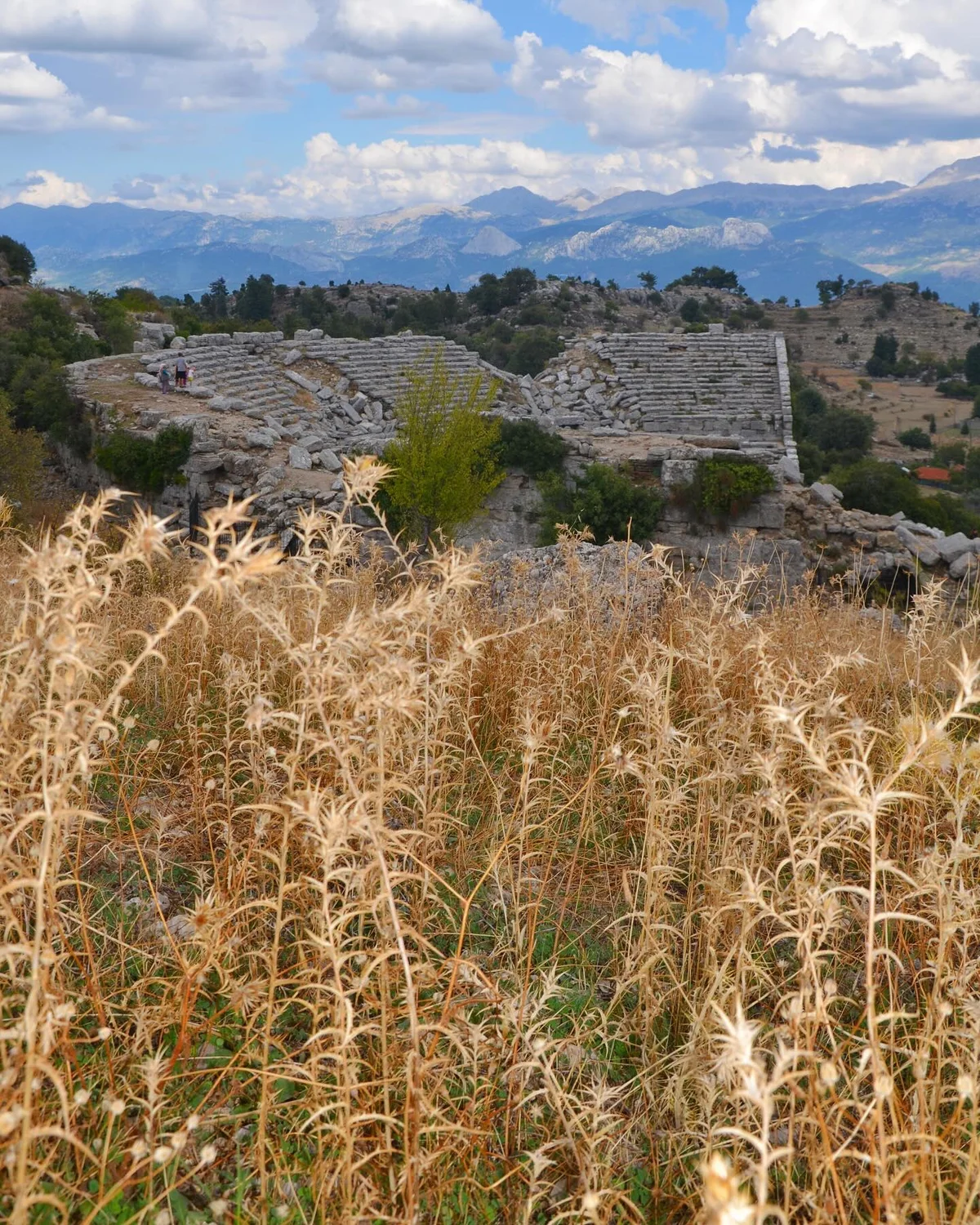 Selge Antik Kenti, tarihi kalıntıları ve doğal güzellikleriyle önemli bir arkeolojik alan olarak öne çıkıyor. Bu resim, antik kalıntılar ve sarımsı otlar üzerinden dağların ve bulutlu gökyüzünün muhteşem bir manzarasını sunuyor! Antalya'nın bu eşsiz doğa-kültür turizmi noktası, tarih ve doğanın mükemmel birleşimini gözler önüne seriyor.