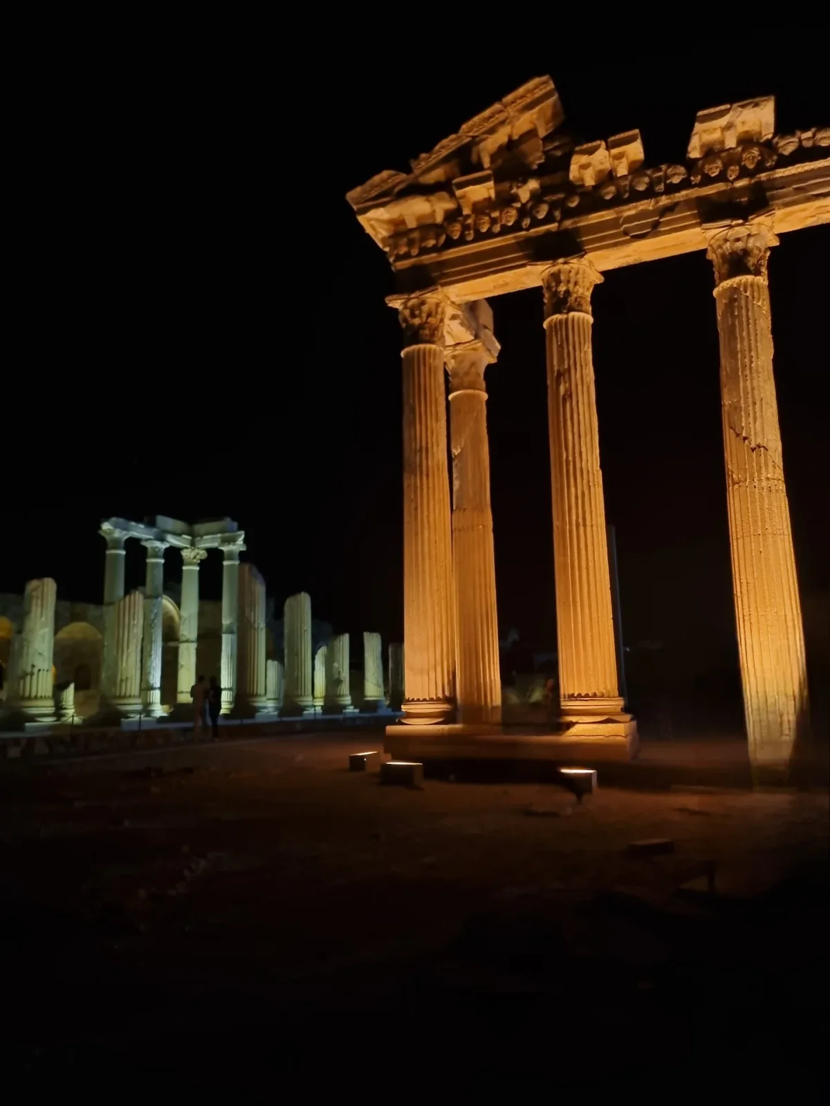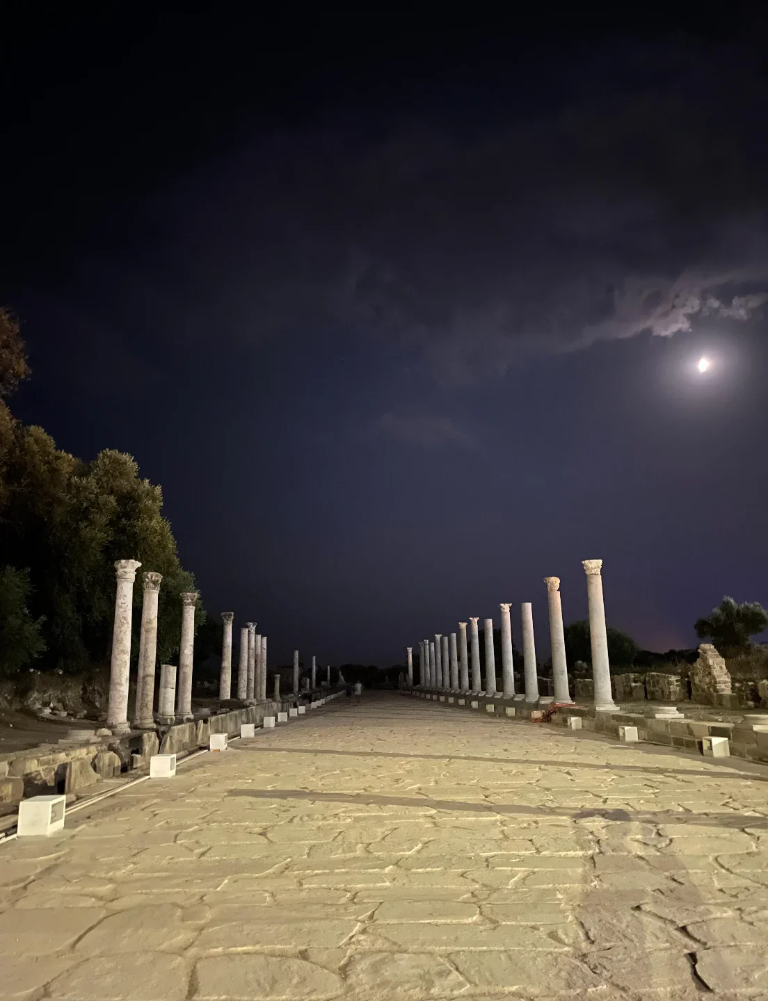 Ay ışığı altında mistik bir yolculuk - Side Antik Kenti'nin sıralı sütunları ve taş döşemeleri, antik dönem mimarisinin zarafetini gözler önüne seriyor. Bu huzur dolu gece manzarası, ziyaretçilerine unutulmaz bir deneyim sunuyor.