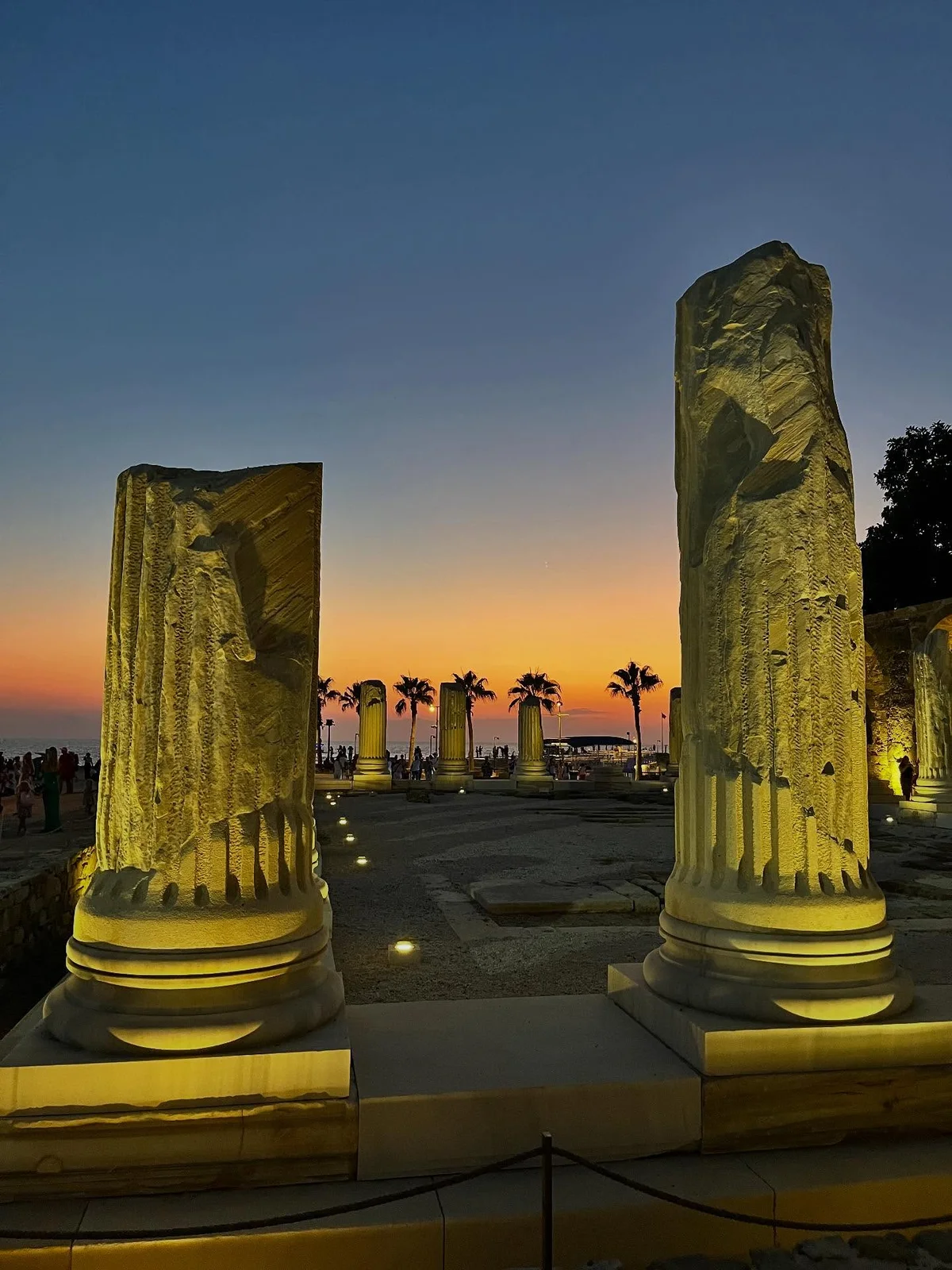 Side Antik Kenti'nde gün batımının büyüleyici renkleri, tarihi kalıntılarla birleşerek unutulmaz bir manzara sunuyor. Palmiye ağaçları ve antik sütunlar, bu eşsiz deneyimi daha da etkileyici kılıyor!