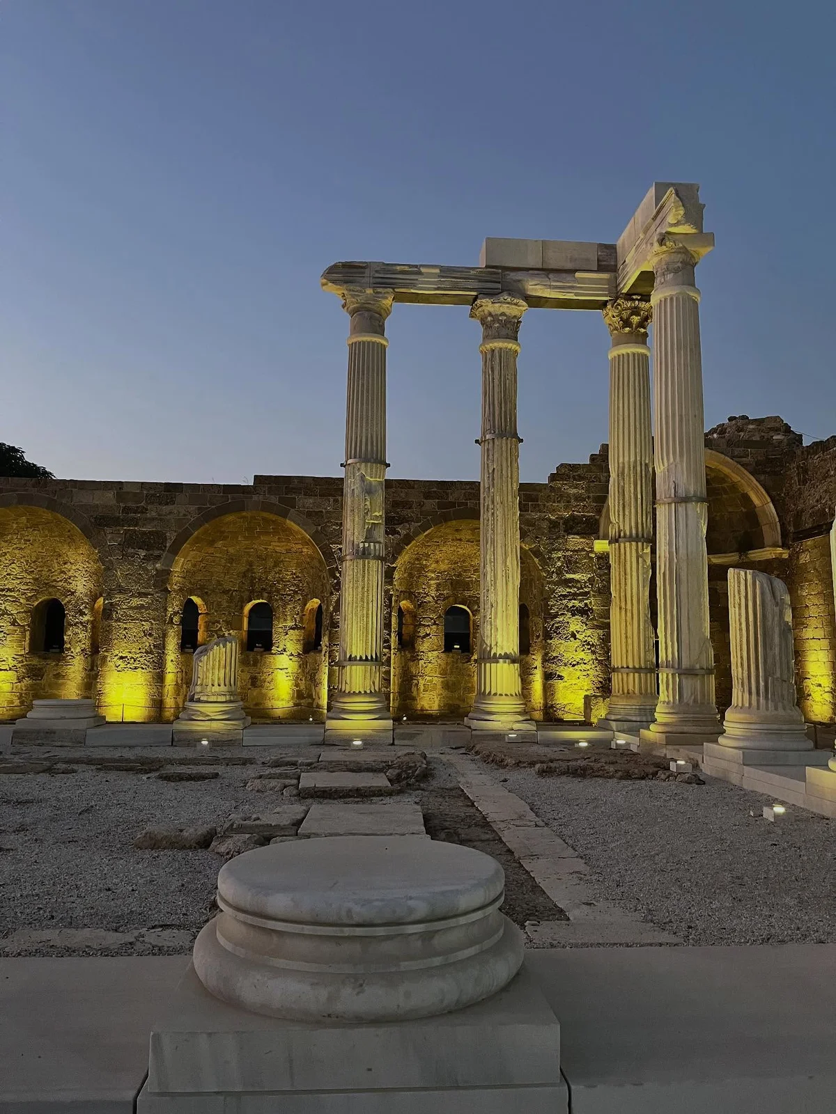 Antik Side kentinin kalıntıları, bu açıdan bakıldığında detaylı sütunları ve taş yapılarıyla büyüleyici bir atmosfer sunuyor. Antalya, Manavgat'ta yer alan bu kültürel miras, ziyaretçilerine geçmişin izlerini sunuyor.