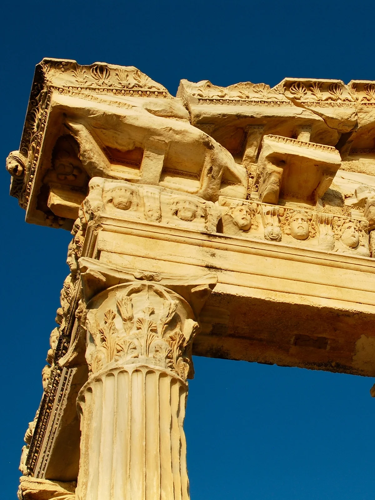 Roma döneminin etkileyici mimari yapıları, bu detaylı çekimde zarif sütunlar ve frizlerle dikkat çekiyor - Side Antik Kenti, Antalya'nın kültür turizmi için bir mücevher! Manavgat, Side Mahallesi'nde keşfedilmeyi bekliyor.